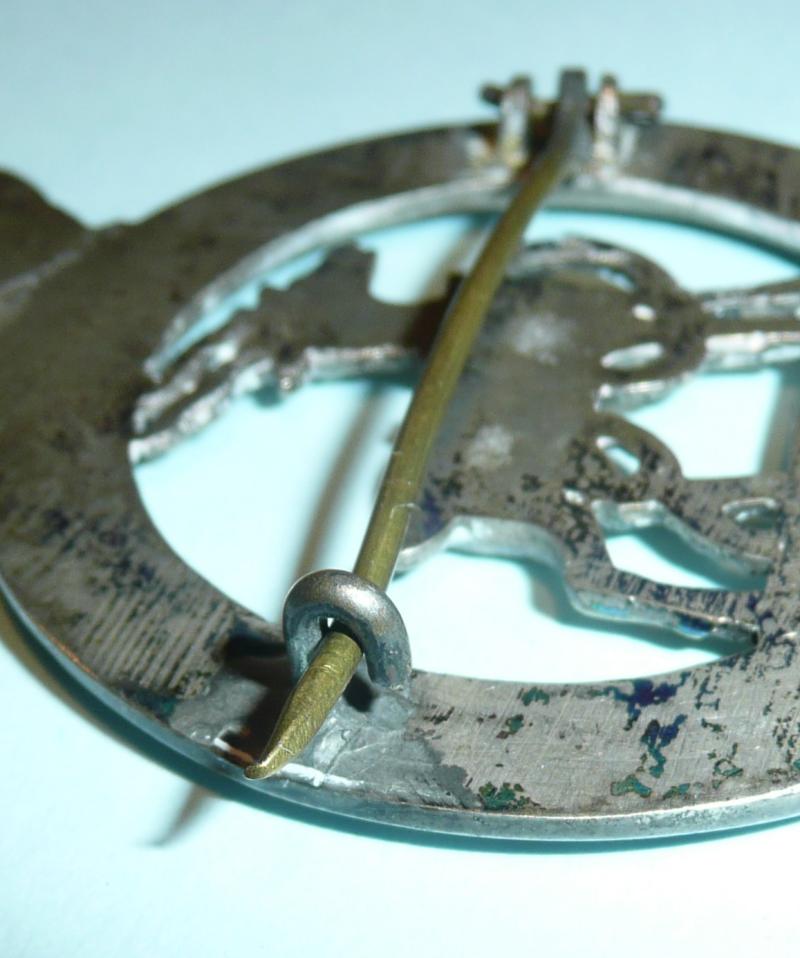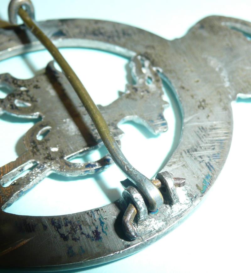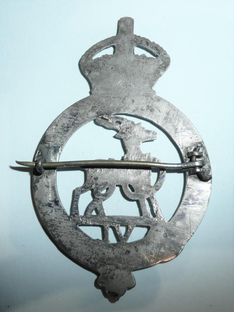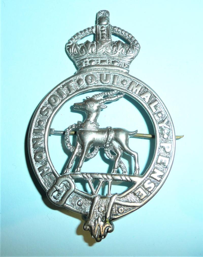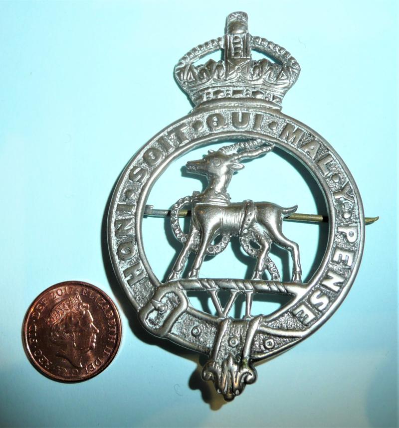 A large and impressive badge nicely cast with flat back and with a stout pin fitting and c clasp, possibly a low grade of silver. The quality, whilst good overall, does suggest theatre made, possibly in India. Some polishing to the antelope otherwise the detail is good. VI below is a reference to the Regiment's pre1881 status as the 6th Regiment of Foot. Apparently worn on the large white leather band pouch, but the pin fitting has a look of a pagri about it, so I wonder whether the band wore this on the foreign service helmet also. Circa 8cms tall. A scarce item. Any additional information welcome.