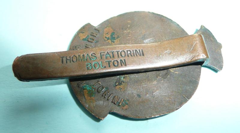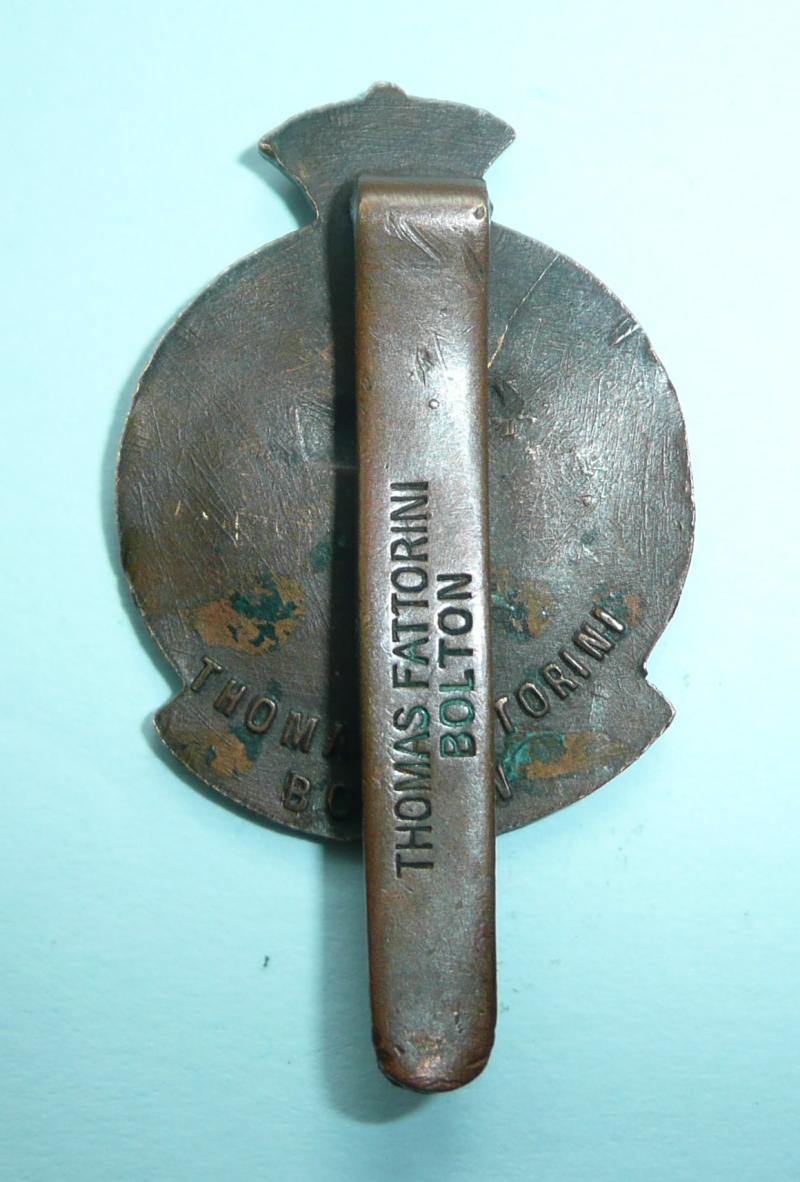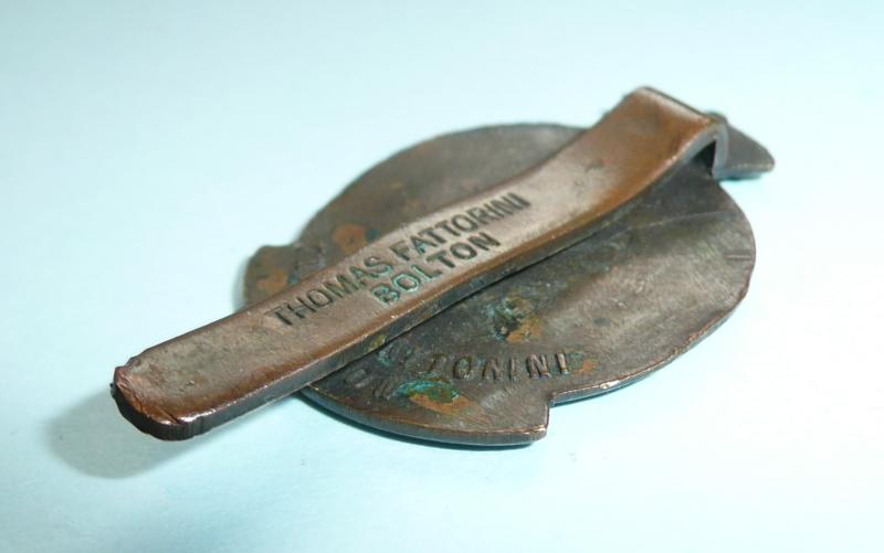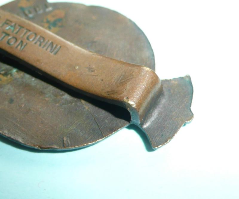 Scarce WW I bronzed cap badge with original slider fitting maker marked twice, correct pattern of stamped naming for Thomas Fattorini, Bolton on silder and then embossed again on the reverse of the badge. Depicts an Ox crossing a Ford to the centre of a crowned circlet bearing the title, 'Oxfordshire Volunteer Regiment' above the motto scroll, Fortis Est Veritas. In very good condition.
