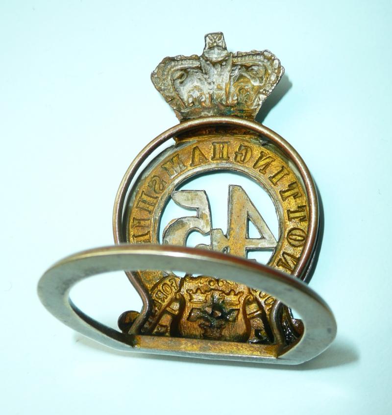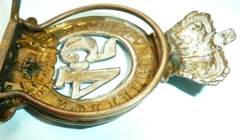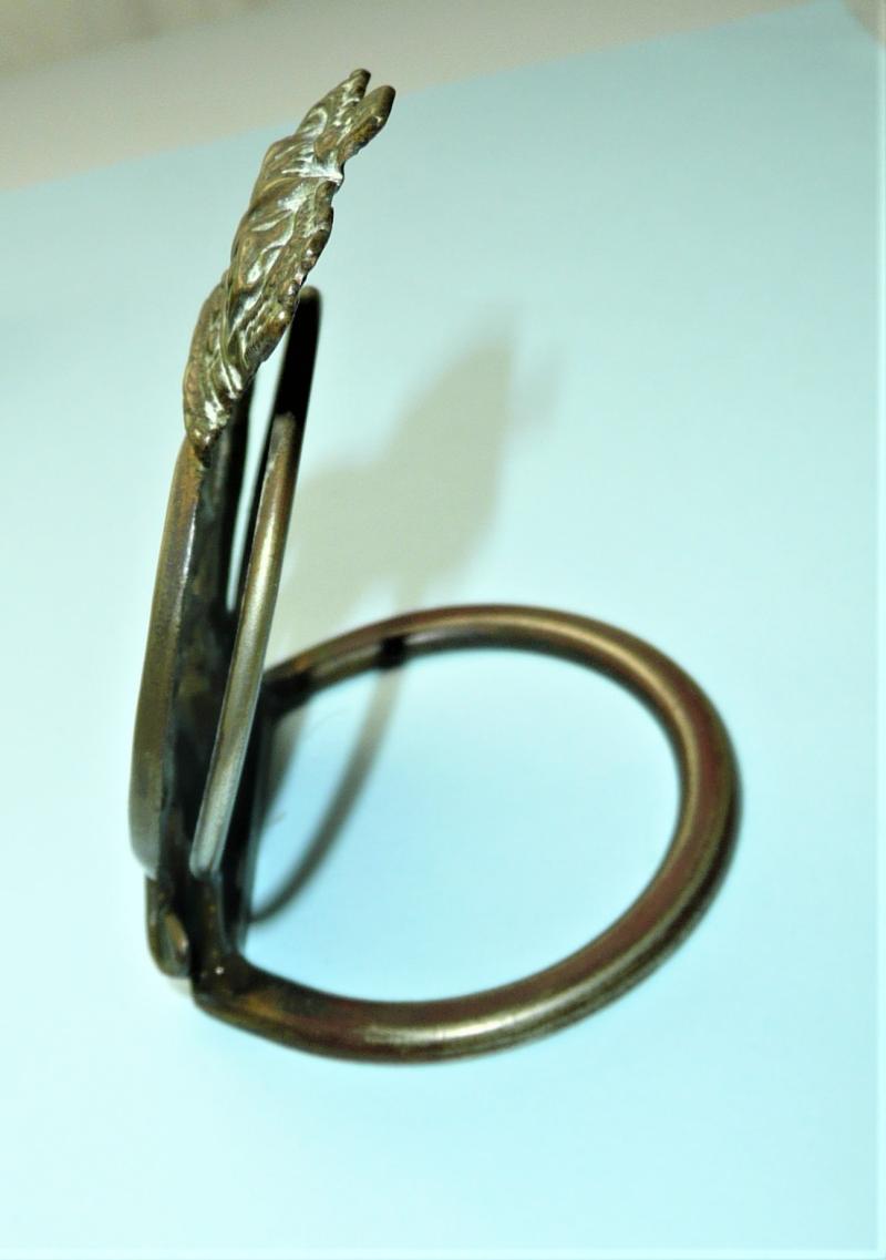 A genuine example with lugs removed (they were north - south) and expertly attached permanently to a brass menu ring stand which has an upright ring for holding the menu card / place setting name card. The crown shaped back to facilitate holding the paper card in place. Probably graced the tables of the 1st Battalion's Regimental Mess post 1881. Some traces of dried polish. Condition as found. An interesting item.