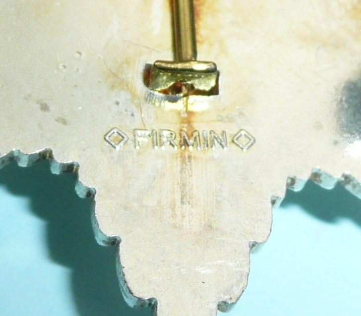 Of two part die cast construction with two original long loops to the reverse and maker marked Firmin. Silver plate and gilt bright and the enamel intact and undamaged. Circa 4.4cms wide. A more recent / modern issue. In super condition.