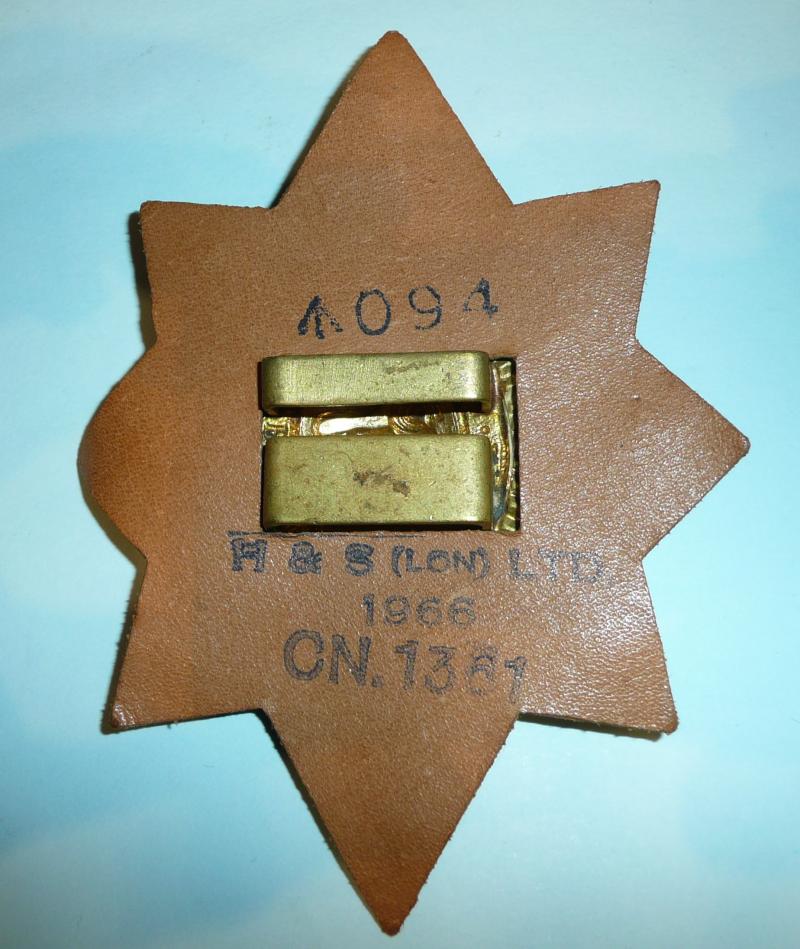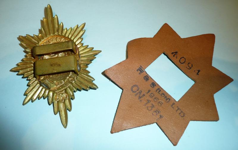 A gilding metal valise badge for The Worcestershire Regiment with an original 'double box' fastening and original 1966 dated patent black leather backing star. Circa 10cms tall. This is the fifth pattern as worn from 1952. Slight polishing to detail of the lion and minor wear to leather backing finish otherwise in good condition.