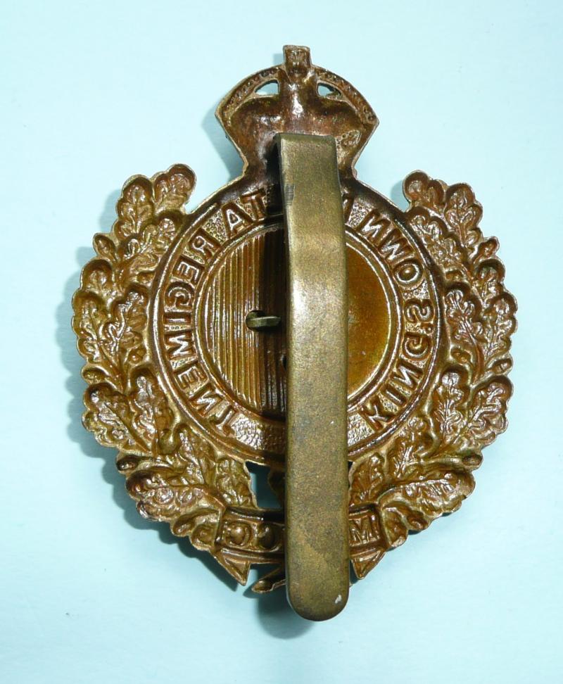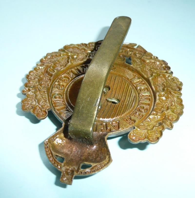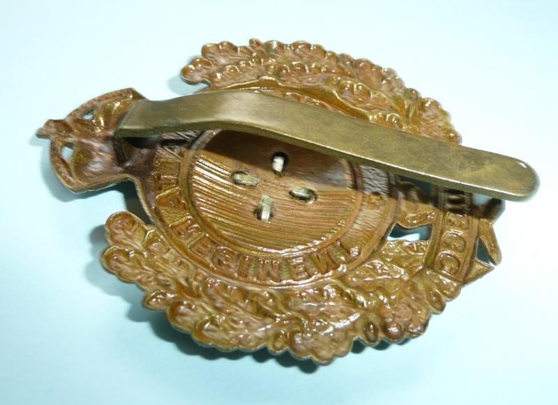 A die struck two part construction cap badge with original slider, bent outwards; possibly for wear in the pagri of the sun helmet. In good condition with sharp detail, badge has possibly been lacquered. Worn 1903 - 1921.