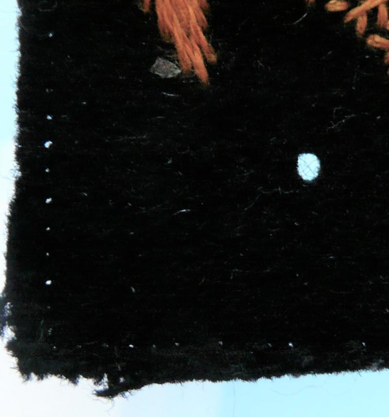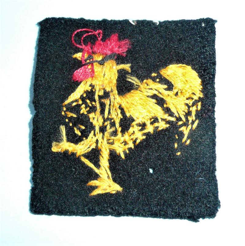 Private purchase item. Embroidered yellow cockerel with red combs on black background. Right facing. One small in hole in backing and sight edge nibbles otherwise colours bright and in good condition.