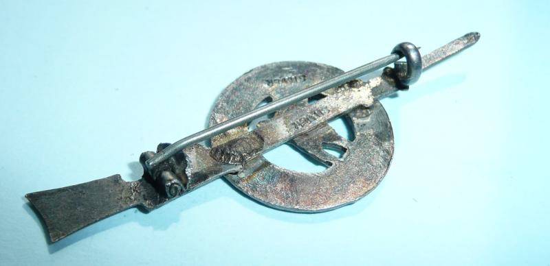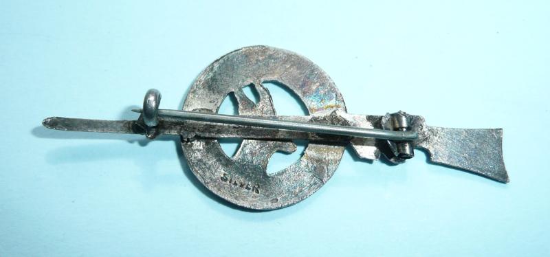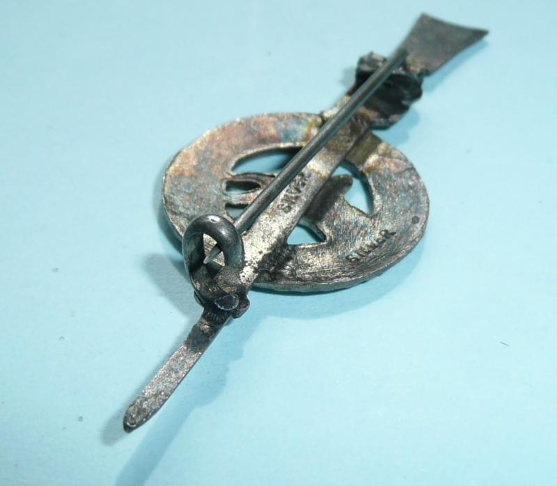 In good condition with no damage to enamel. Slight dulling with age. Original pin fittings. Stamped silver. WW1 rifle and bayonet design. Comm BoHa (250)