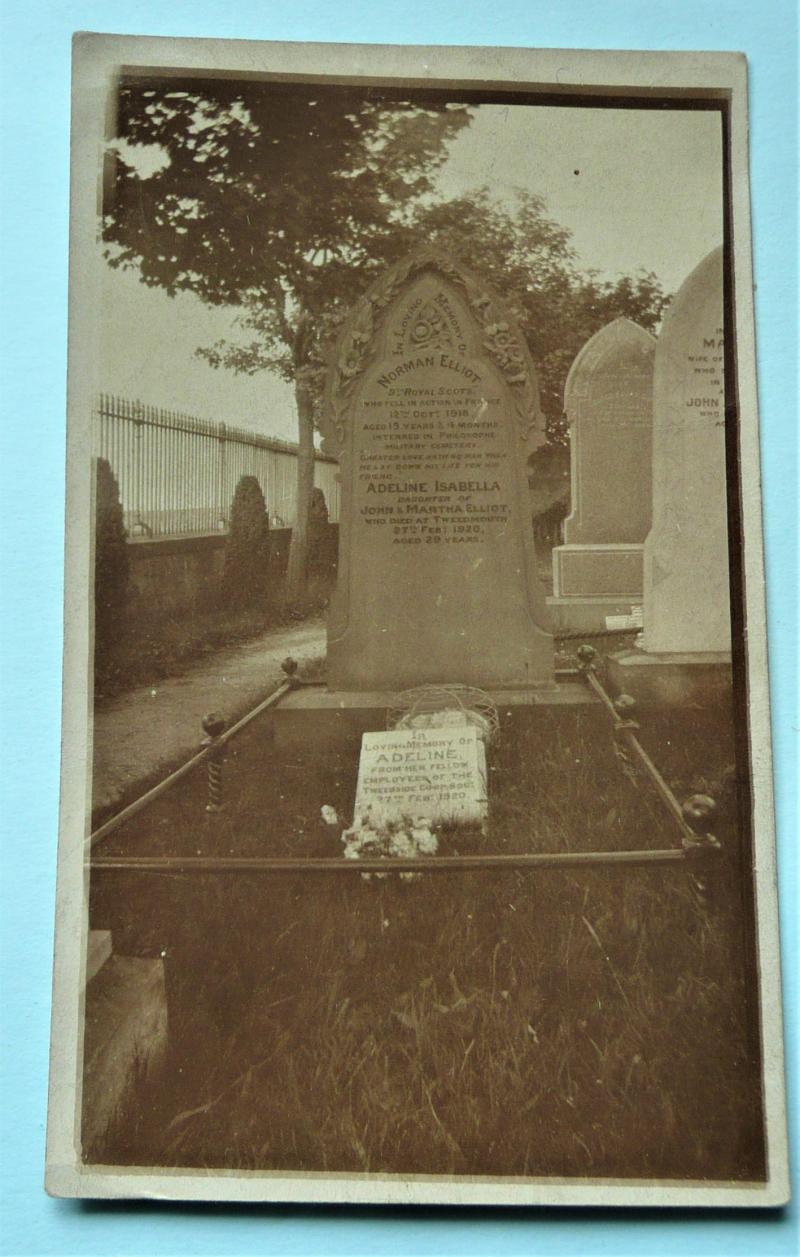 A photo of a grave stone in an unidentified Tweedmouth church graveyard (although I beleive they were methodists) commemorating Norman Elliot of the 2nd Royal Scots who fell in France aged 19 on the 12th October 1918 and who was interred at Philosophe Military Cemetery (in Pas de Calais, France). So this soldier has two headstones, this one and the one in the CWGC British Military Cemetery in France. It looks like the parents of Norman (John and Martha) lost a daughter also in 1920 (possibly to the influenza epidemic) and the stone commemorates them both. There a supplementary plaque at the front of the grave from the daughter's colleagues at the Tweedside Co-Operative society, presumably her place of work.