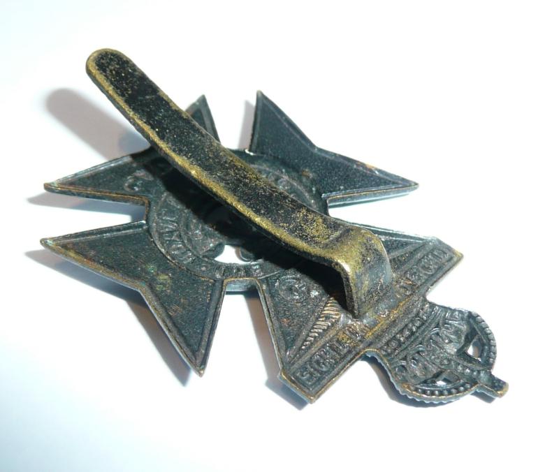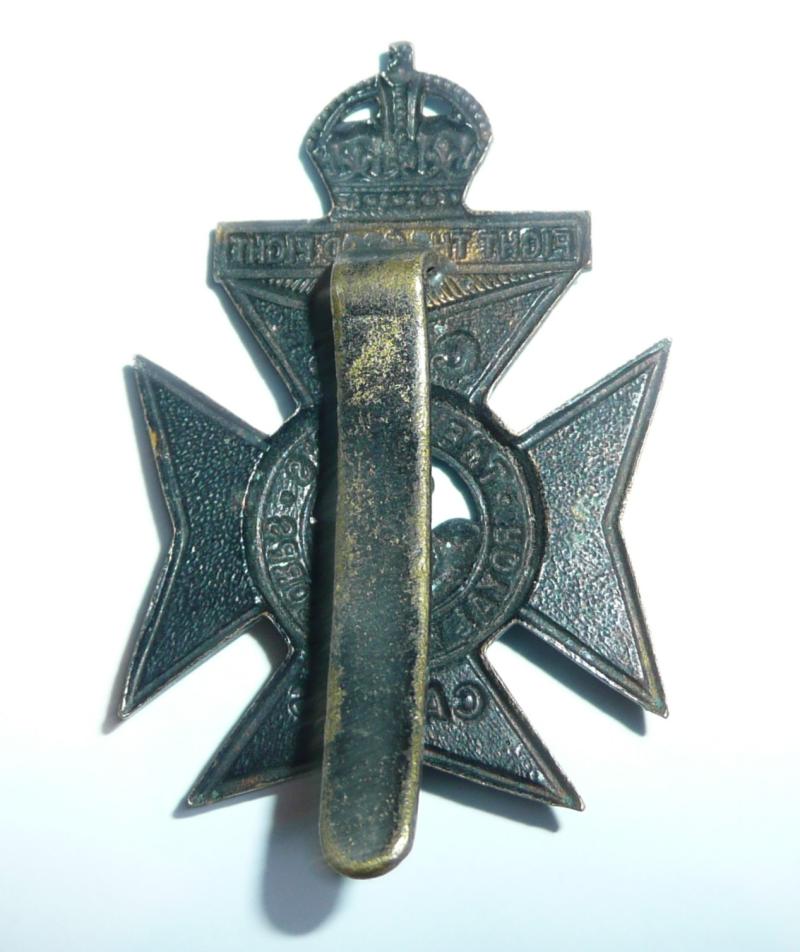 Incorporated in to the King's Royal Rifle Corps (KRRC) from 1917. Blackened brass with original slider. Some wear to highpoints which makes an attracitve finish.