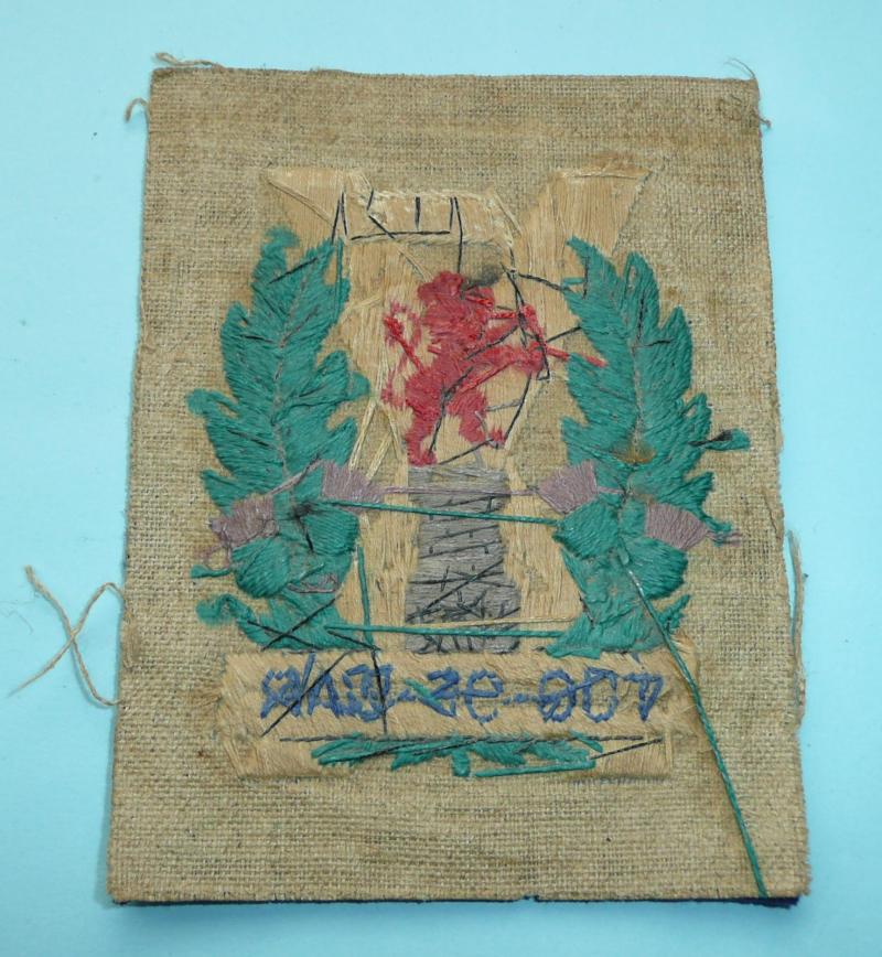 Impossible to date to either WW1 or WW2 as the raised foot of the lion was used on badges of the Tyneside Scottish in both of these wars. So potentially of Northumberland Fusiliers, Durham Light Infantry, Black Watch or possibly Royal Artillery interest too! It has some moth nibbles to side edges. It is old, well made and tug of war was popular in the trenches in the First War. One of three found in a house clearance in the North East (this is the last one I have). So it is possible they were made but never actually issued. A novelty and would welcome any more information. Circa 10cm by 8cm. Rare.