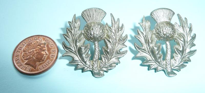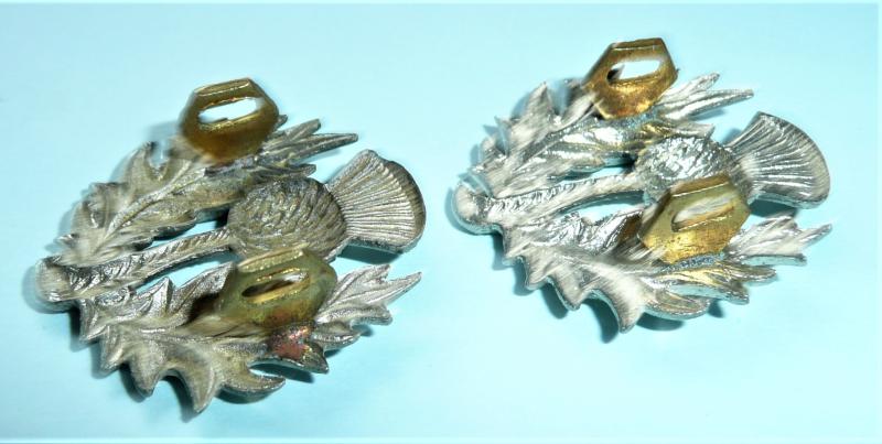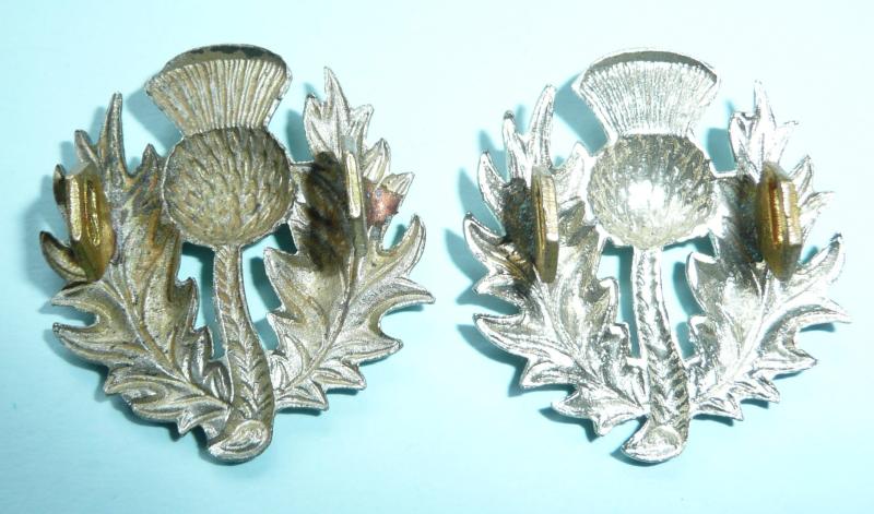 The MHS Bulletin referred to below states that the unit wore a white metal thistle as a collar badge and that this was similar to but smaller than that worn on the glengarry and the sporran, being 1 inch wide. Whilst a few mm wider than that statement, they do same to fit the bill.