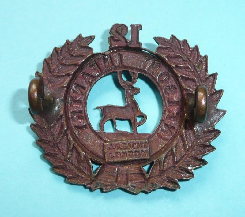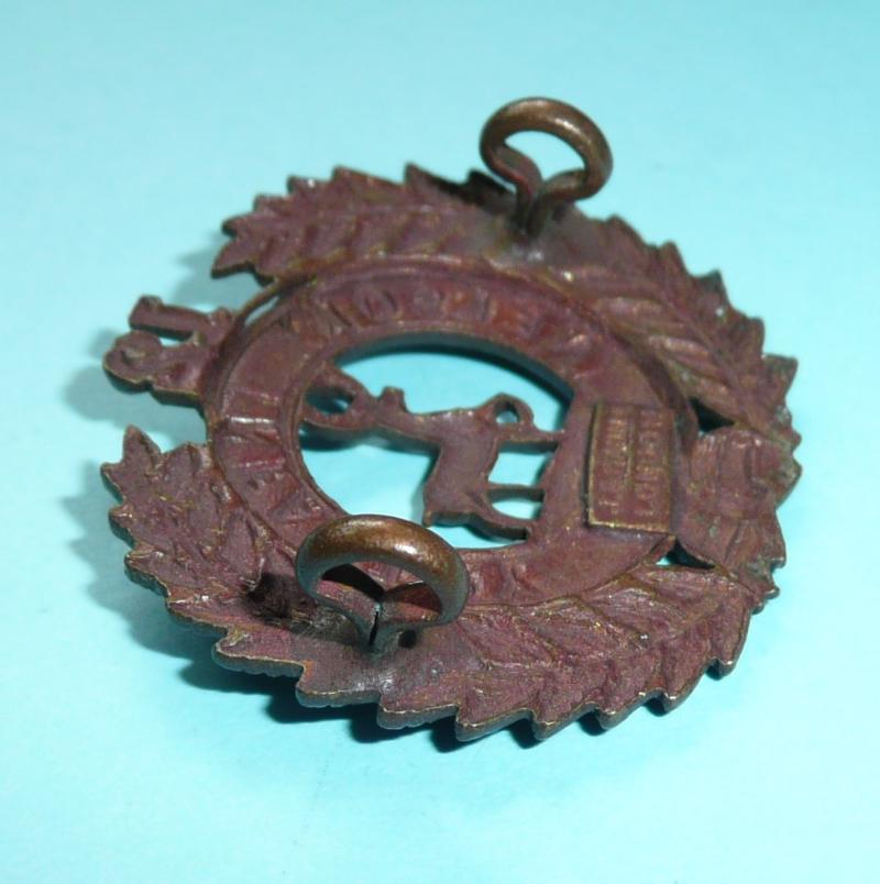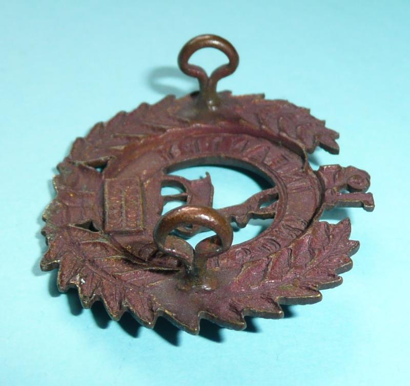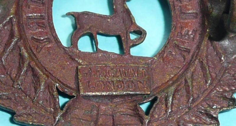 A small die struck bronze cap badge with two original loops and a JR Gaunt London tablet to the reverse. Circa 4.2cms wide and 3.3cms tall. Worn circa 1911 - 1917 only. Collar badges were smaller. In very good condition.