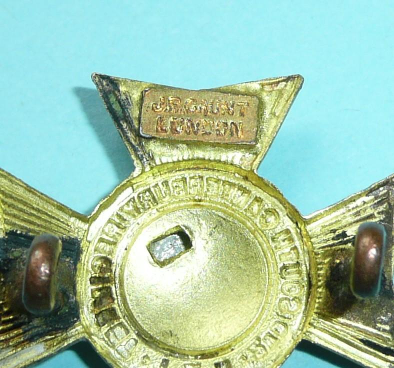 In near mint condition, single sweat /braising / expansion hole to reverse of mounted central device, two original loops and maker's tablet JR Gaunt to reverse. A scarce badge (collars were similar but worn without the scroll). Circa 1911 - 1921.