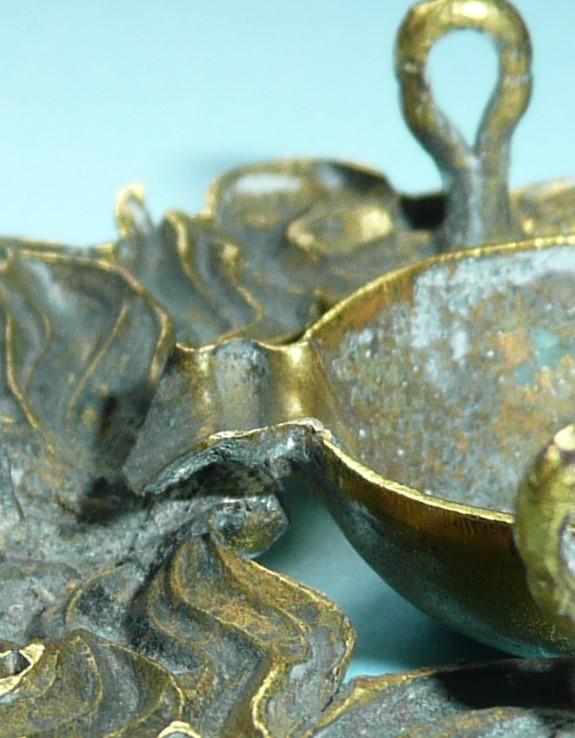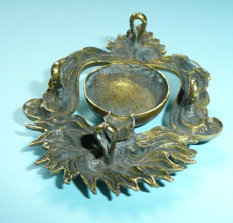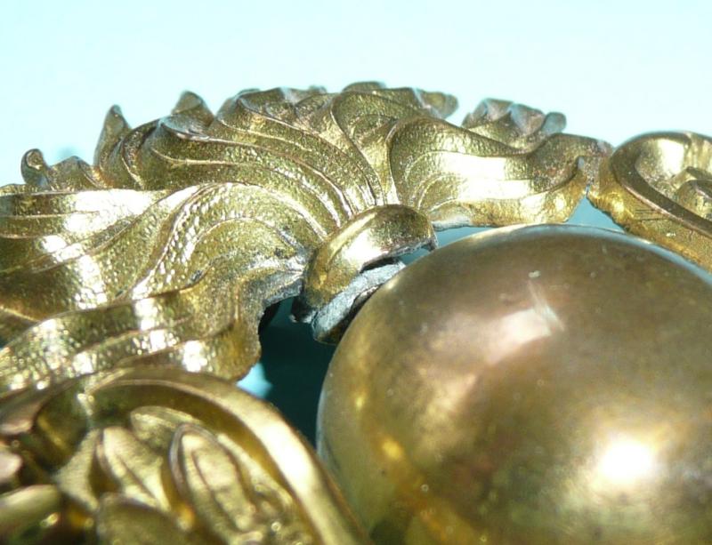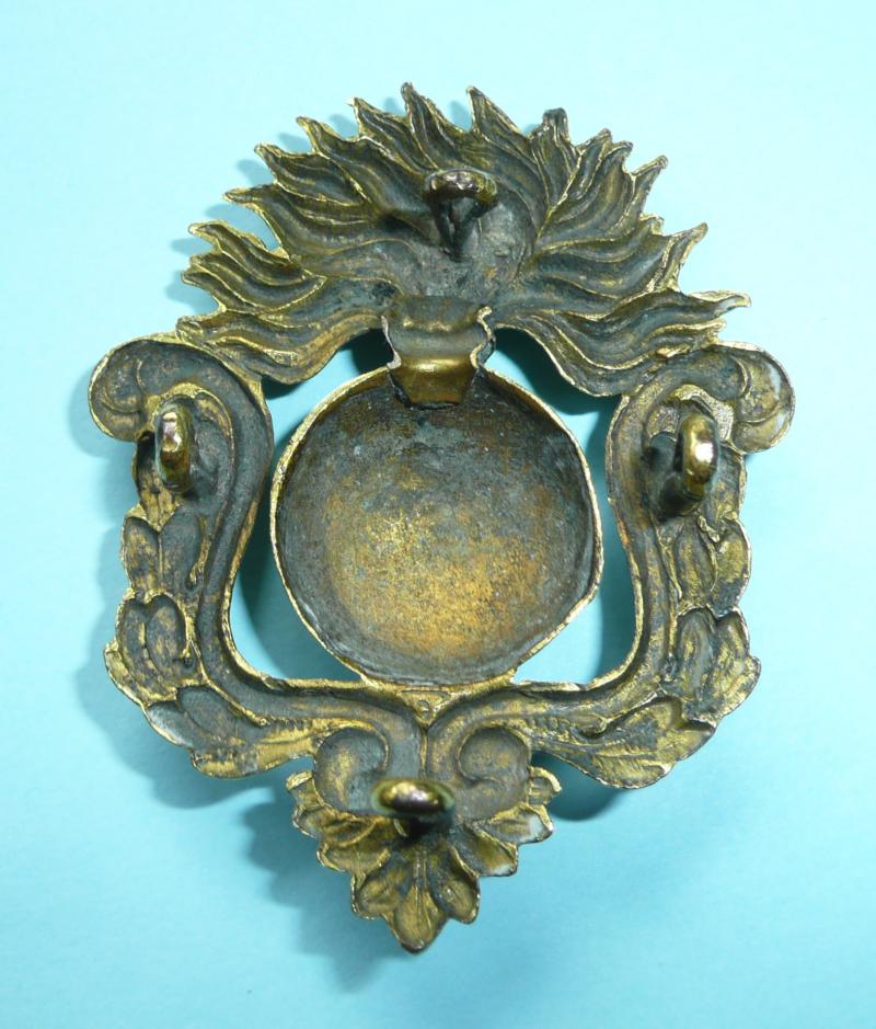 Worn with a separate gilt buckle and slide, the belt tip badge was found at the end of the full dress officer's belt. See my item 64909 for the whole ensemble. The neck of grenade has sprung loose from the flames, but looks ok from front. Some wear to gilt on ball of grenade from service wear. All four original loops. Condition reflected in price. No returns on this item.
