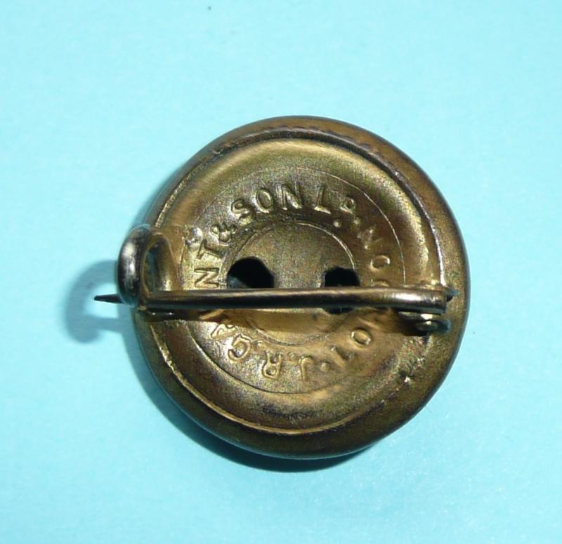Circa 19mm in diameter, shank removed and replaced with brooch pin fitting, back-marked JR Gaunt Ld, London. Dated 1914 to front. Gilded finish, slight wear but detail very good; pin clasp functional.