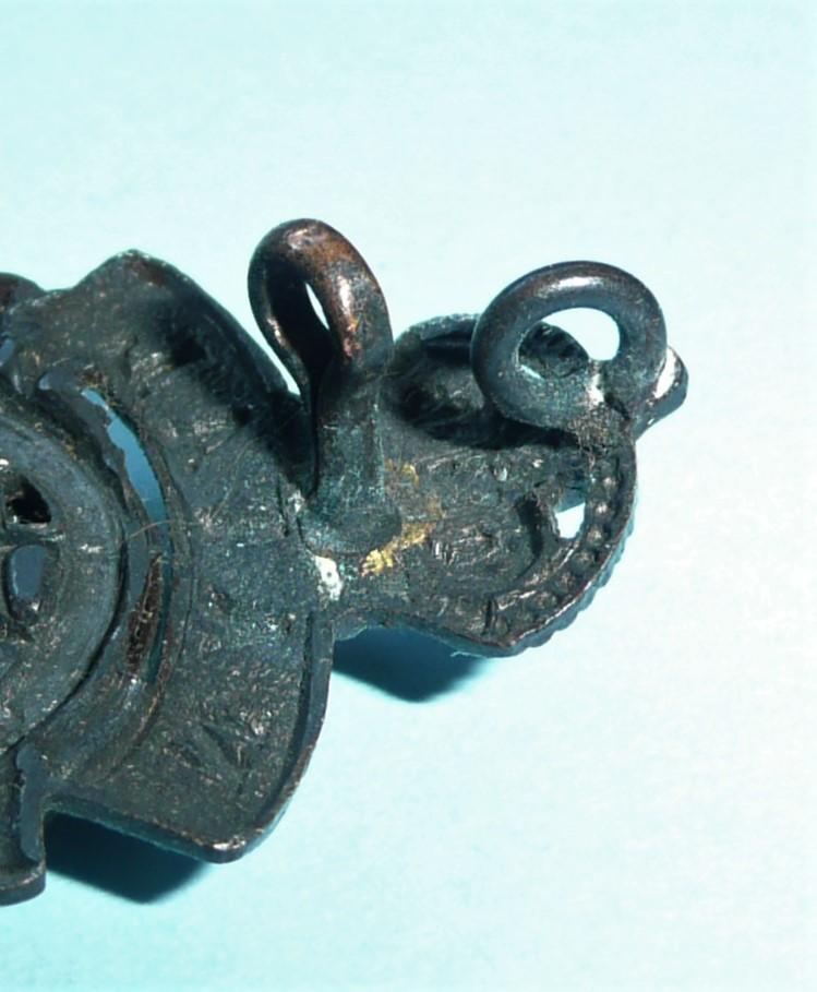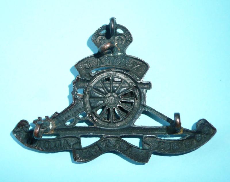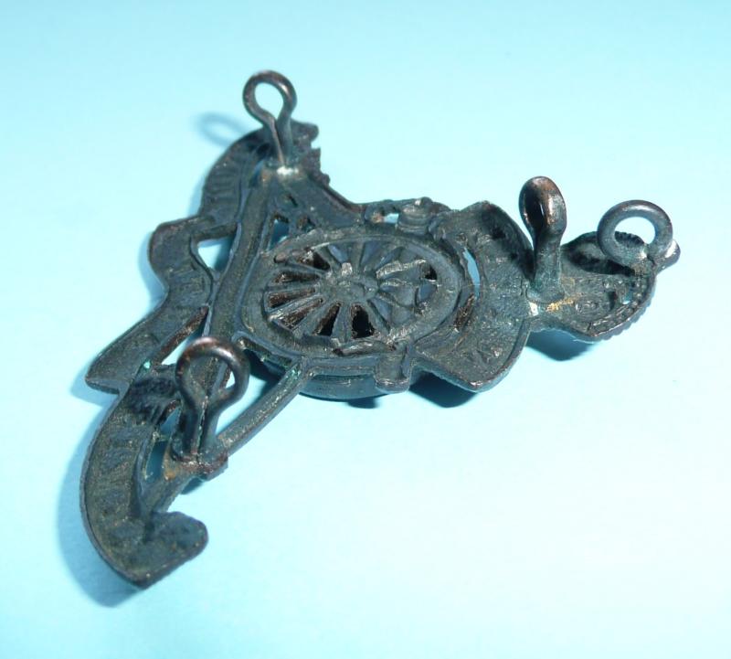 An early full size example as worn on the slouch hat with three of three original loops to the reverse. Mounted wheel, fixed in place so does not turn. King's crown so pre 1952. Good colour with minimal wear. Crown shaped backwards with the usual additional ring attached to back of orb for securing in the slouch hat. This would have originally had another ring fitted to it to be attached to a hook fitted to the slouch hat. This practice only from 1902 - 1908, although the badge design itself continued in use until 1960. In very good condition. Thanks to Keith for confirming this is the pattern worn on the slouch hat and how and when worn.