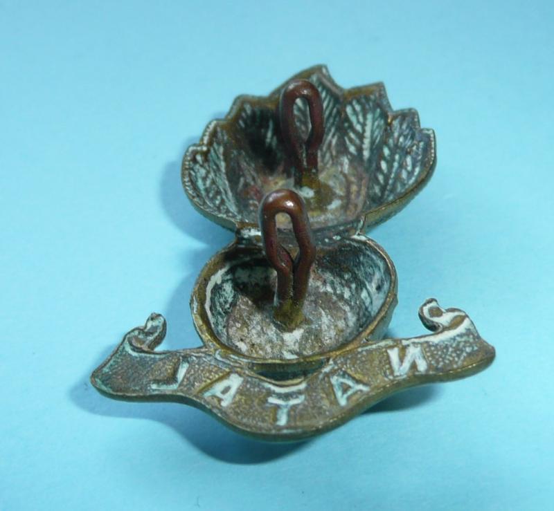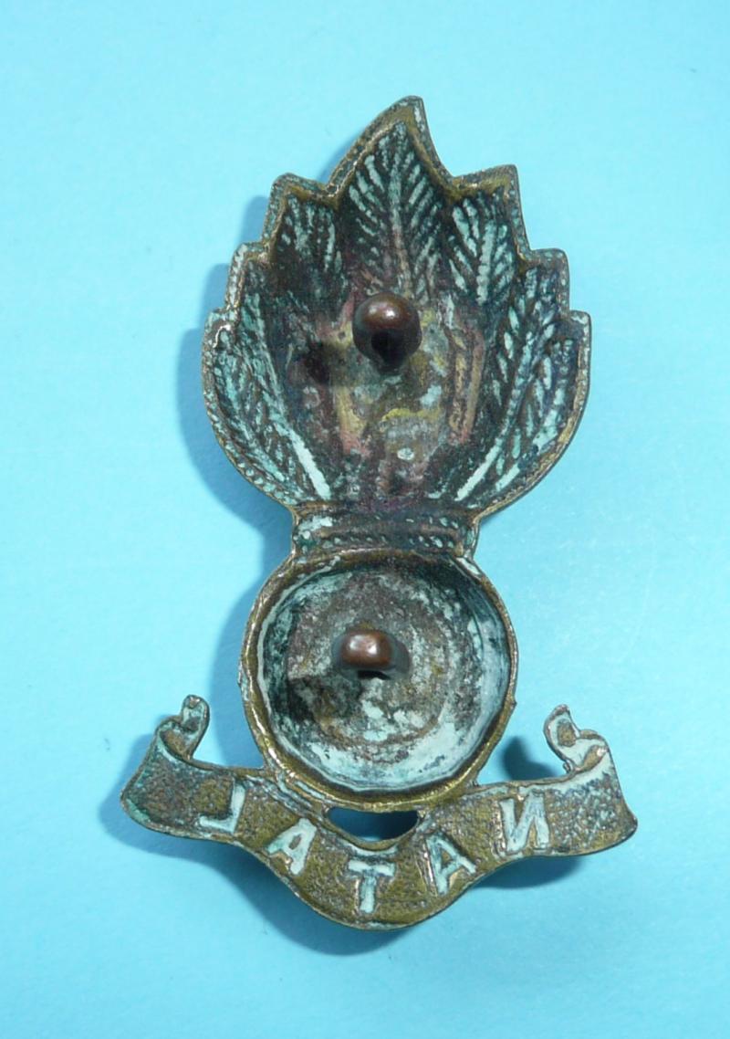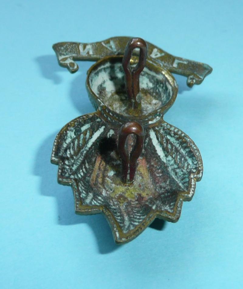 A grenade of seven flames above a scroll inscribed “Natal”. Worn in brass metal 1920s-1940s and again1949-1967. Two original lugs, these have been pinched but still functional. Circa 4.7cms tall. In good condition.
