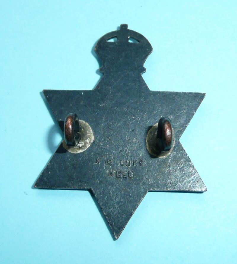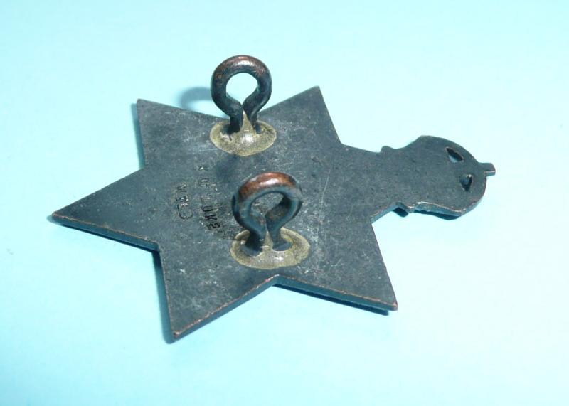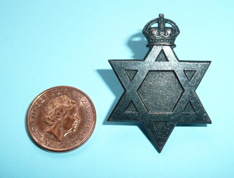 WW2 blackened bronze die cast king's crown cap badge with two original loops and makers details for Luke Melbourne to the reverse as worn by Chaplains of the Jewish Faith. The Star of David surmounted by the crown. Some light wear to black finish otherwise in very good condition. Circa 3.8cms tall. Rare.