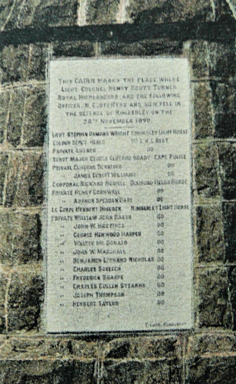 The memorial cairn commemorates the officers and soldiers killed during the second battle of Carter's Ridge in November 1899 during the Siege of Kimberley, Cape Colony (modern South Africa) during the Second Boer War. The troops commemorated are mainly from The Kimberley Light Horse.