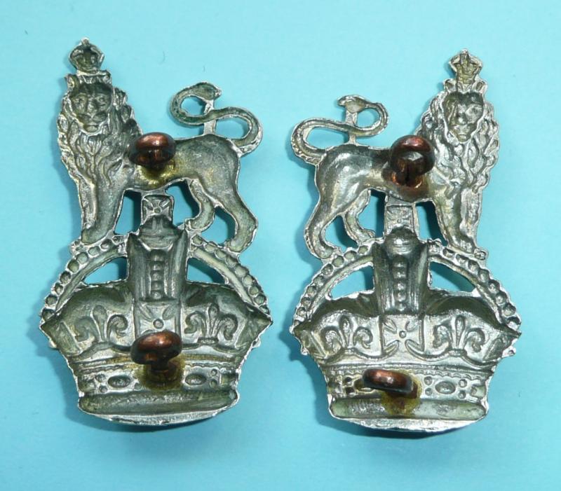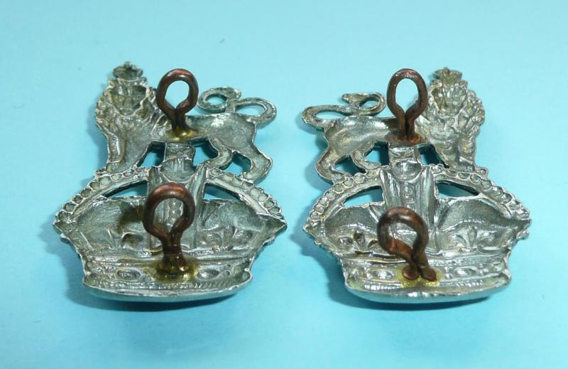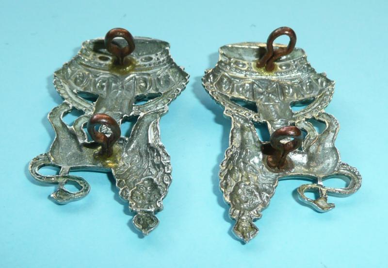 A facing and matched pair of large die struck white metal collar badges with two original loops (n-s) to the reverse of each. Tall at circa 4.3cm in height. Some loss of detail from service wear and polishing otherwise in good condition.