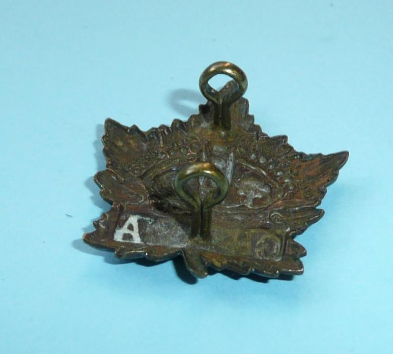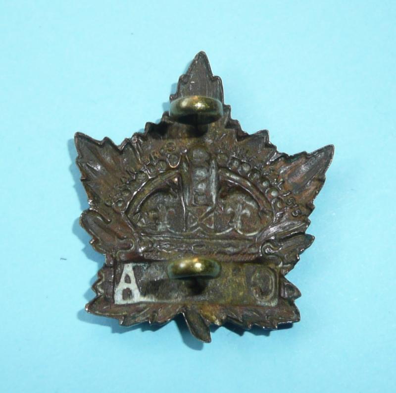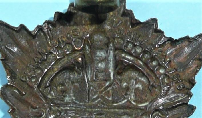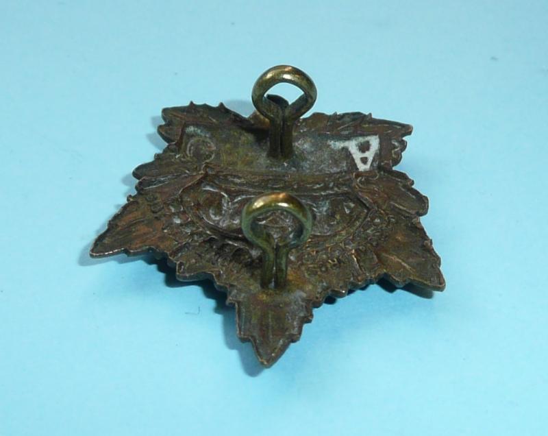 A die struck collar badge with two original loops to the reverse and embossed 'Caron Bros - Montreal 1915' to reverse of crown. In very good condition. Comm ViCr