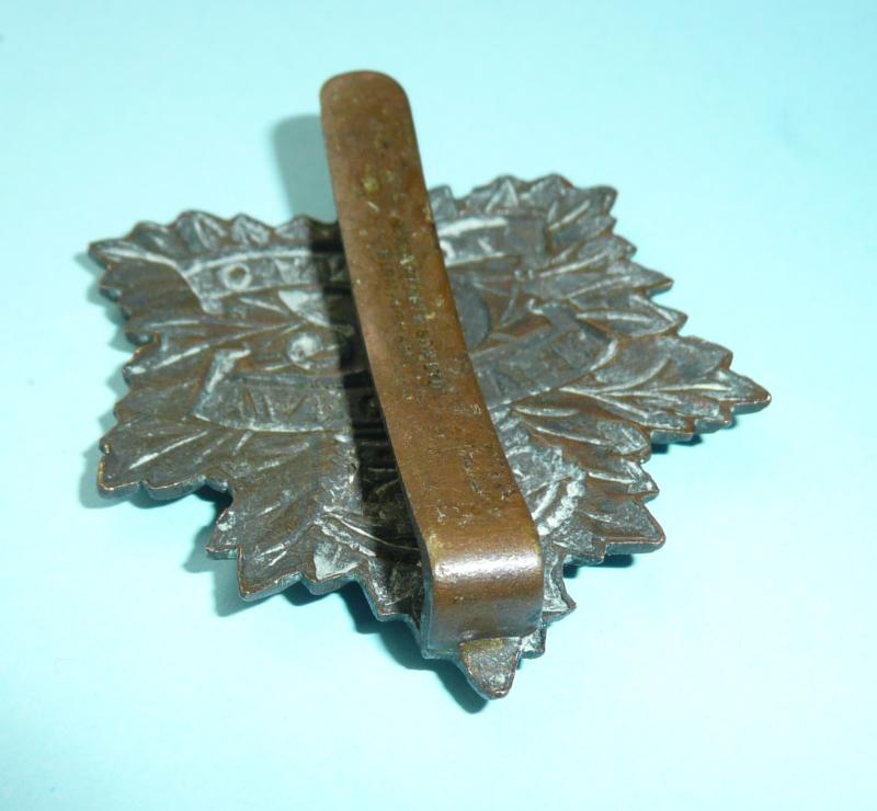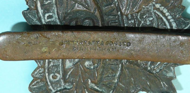 A UK made die struck cap badge with original slider. Slider is stamped in two lines (feintly) "Tiptaft & Son Ltd / Birmingham". In good condition.