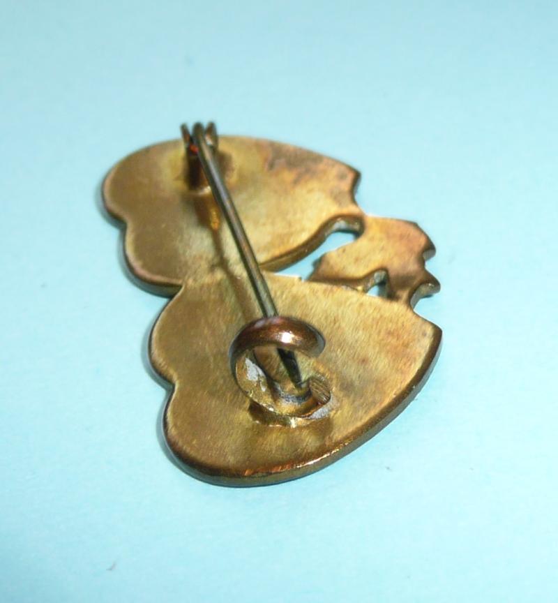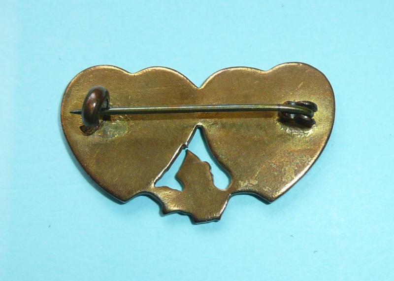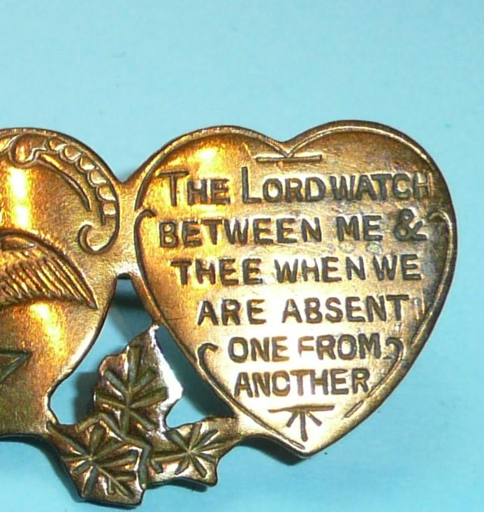 A mizpah gilt brass sweetheart brooch in the classic double heart shape, to one side it has the pilot wing emblem for the RAF and on the other heart script which reads, ‘the lord watch between me & thee when we are absent from one another’. It comes in good overall condition for age, with fully functional and original pin fittings. It measures just over 3.4cms wide.