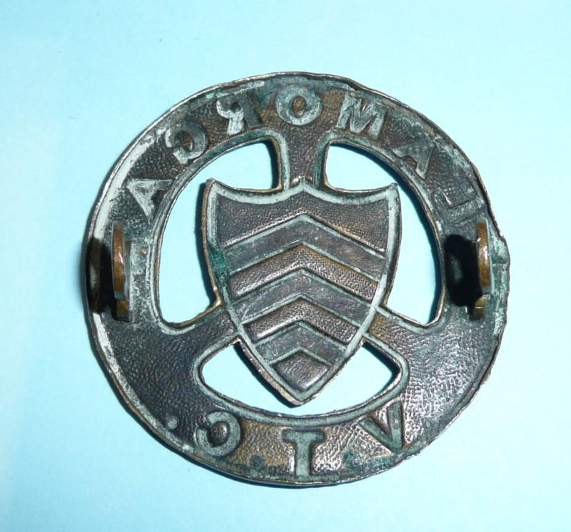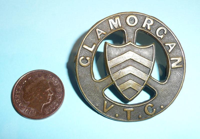 A very scarce WW I bronzed-brass cap badge with two original flat connector style loops to the reverse (typical to Fattorini made cap badges but no maker's name evident). A shield bearing three chevrons to the centre of a circlet carrying the title, " Glamorgan V.T.C." Circa 4cms in diameter. Some service wear to rim and dried polish, otherwise in good condition.