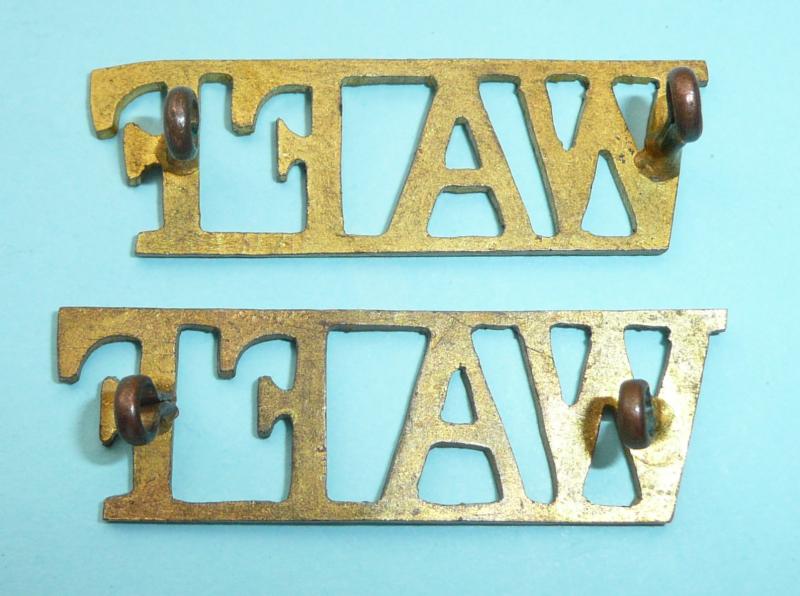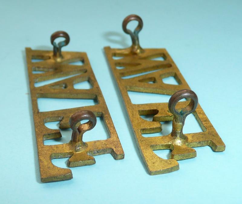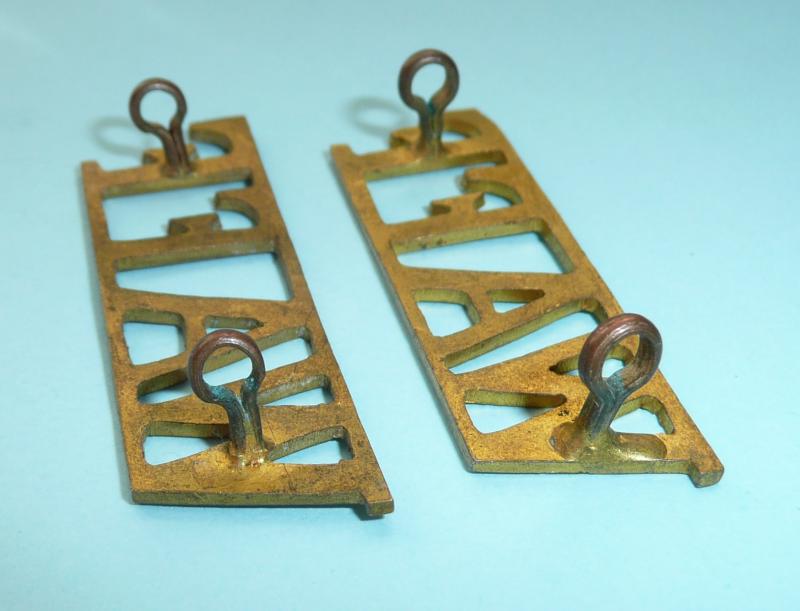 An early pair of titles, as worn from 1906 - 1928. Each circa 4.8cms wide and 1.2cms tall. In good worn condition, minor bending to loops and the loops appear to be of different lengths otherwise a close match.