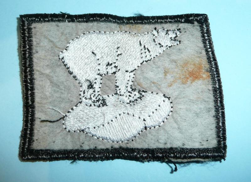 An embroidered white polar bear on a iceberg on black cloth rectangle. In very good unissued condition, slight fold evident and small stain to reverse. A modern issue.