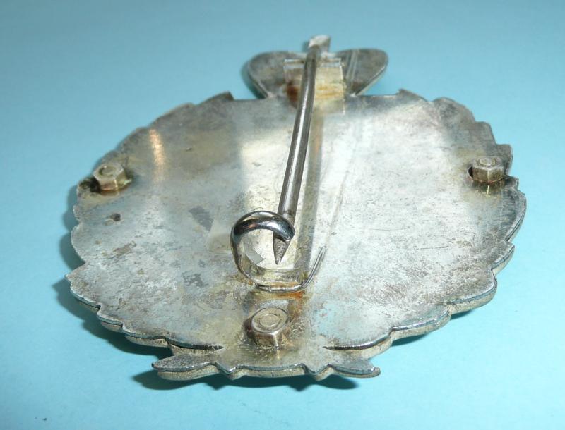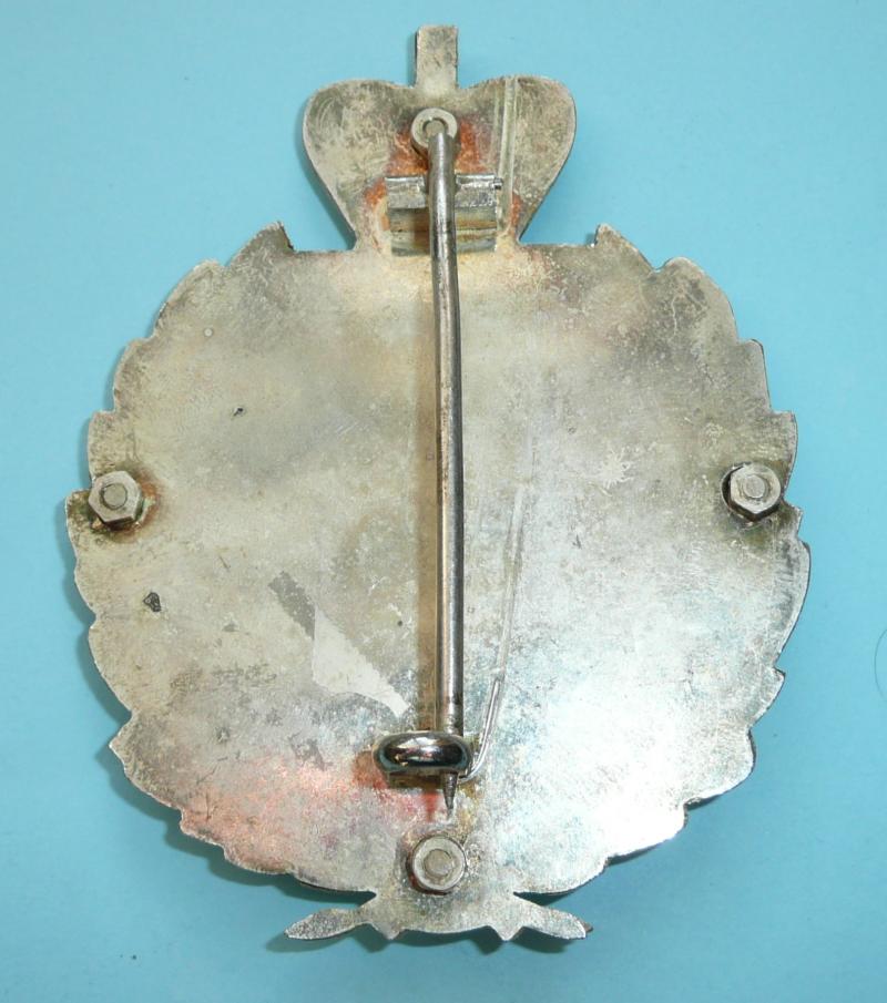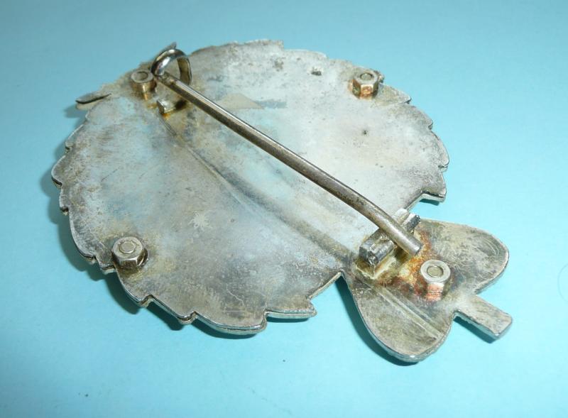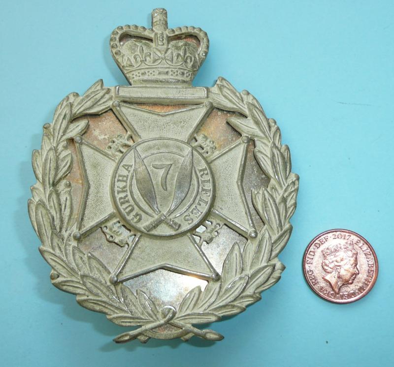 EIIR 7th (Duke of Edinburgh’s Own) Gurkha Rifles Piper's Plaid Brooch, superb quality frosted silvered badge with crowned laurel spray, Maltese cross with the centre having crossed Kukri knives and number 7, around the edge ‘GURKHA RIFLES’. Reverse with backing plate and broad vertical pin and hook fixing. Fine quality made badge but with some dulling to the frosted finish. Same pattern as worn by officers as a Shoulder Belt Plate (7GR A2), also fitted to a backing plate but with a strong vertical pin fitting making this is a piper's badge to pin to the plaid over the left shoulder. Worn from 1964 to 1968.