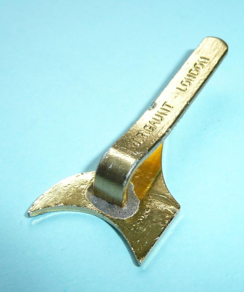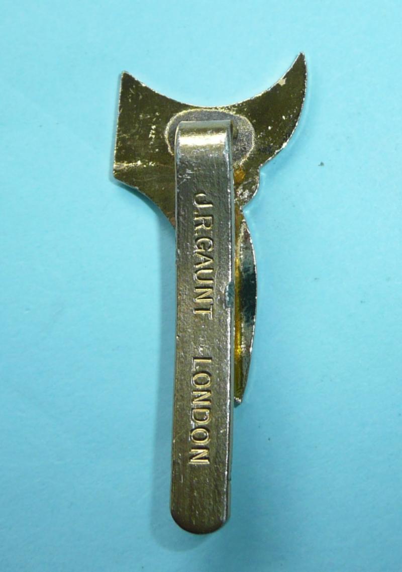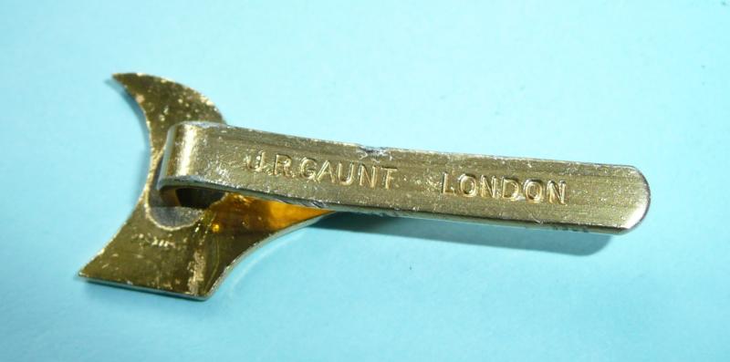 An gold coloured anodised aluminium Cap badge with original slider, which is stamped JR Gaunt London. Some surface marks to finish otherwise in very good condition.