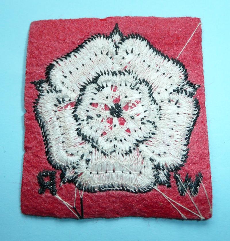 Machine-embroidered white rose outlined in black on a red background with W R in the lower corners. Appears to be in unissued condition.