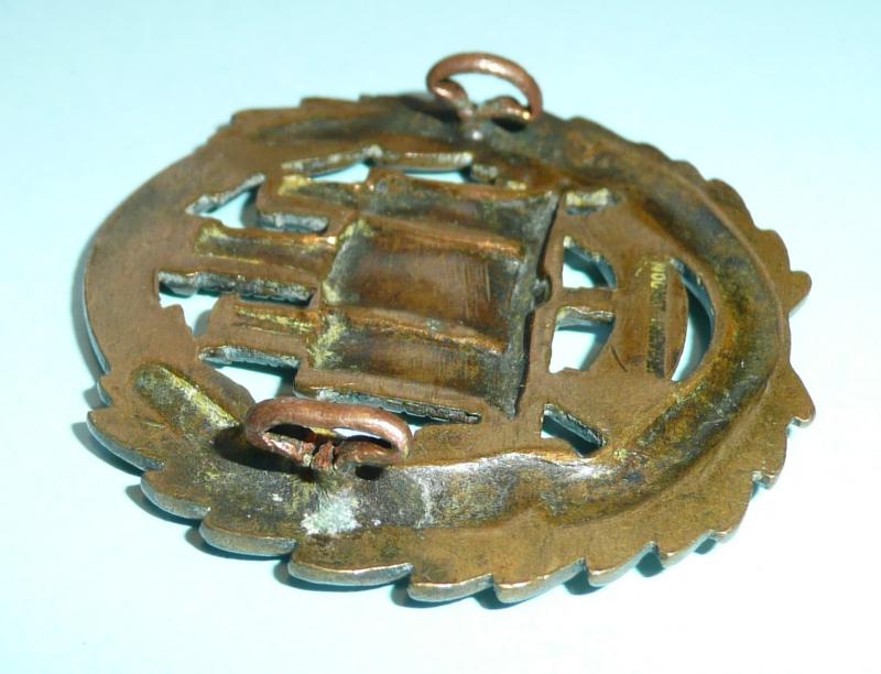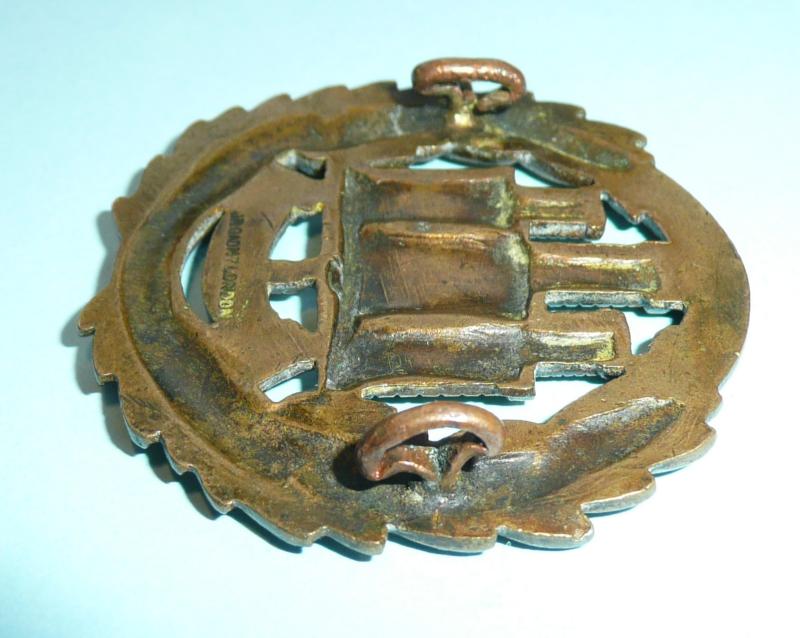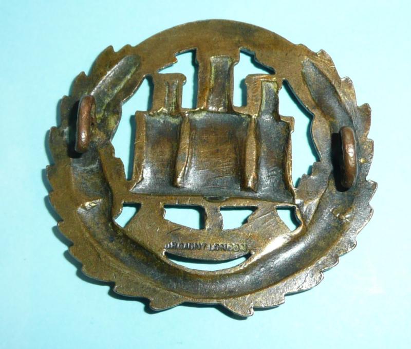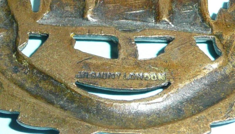 Cap badge sized but introduced as a collar badge also in 1902. With two original loops (Squashed back for comfort) and maker marked JR Gaunt London. Lighter bronze finish. Could double up as a cap badge.