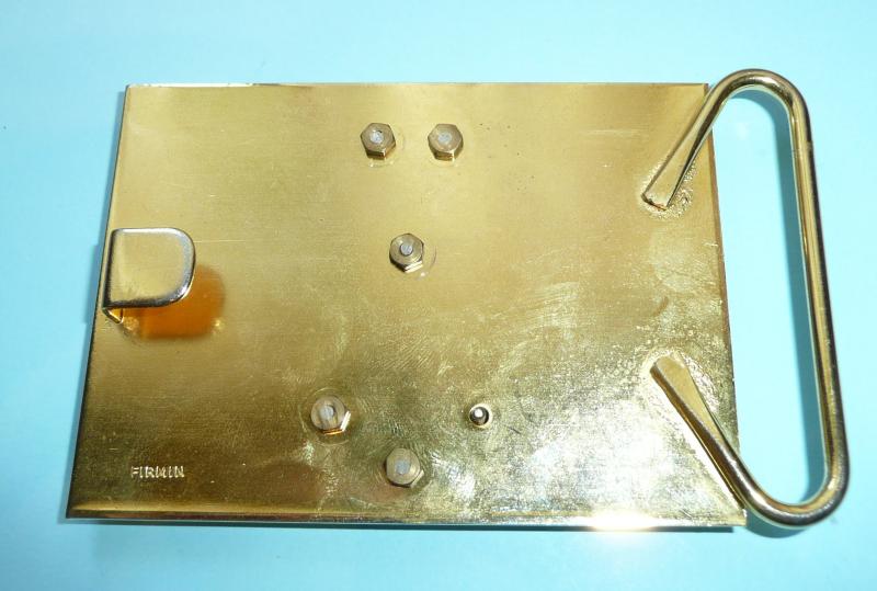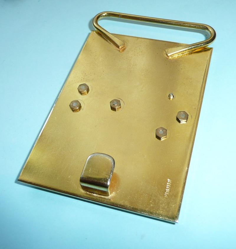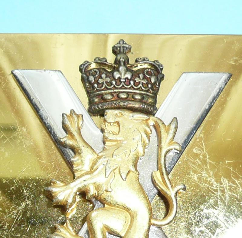 Scottish crown bronzed above separate bright silver plated cross of St. Andrew, with gilt Scottish Lion separately mounted above in silver plated scrolls Nemo Me – Impune -Lacessit all mounted on a gilt backing plate, missing other belt loop and some light scratches to finish of backing plate from service wear, otherwise in good overall condition. Maker marked Firmin.
