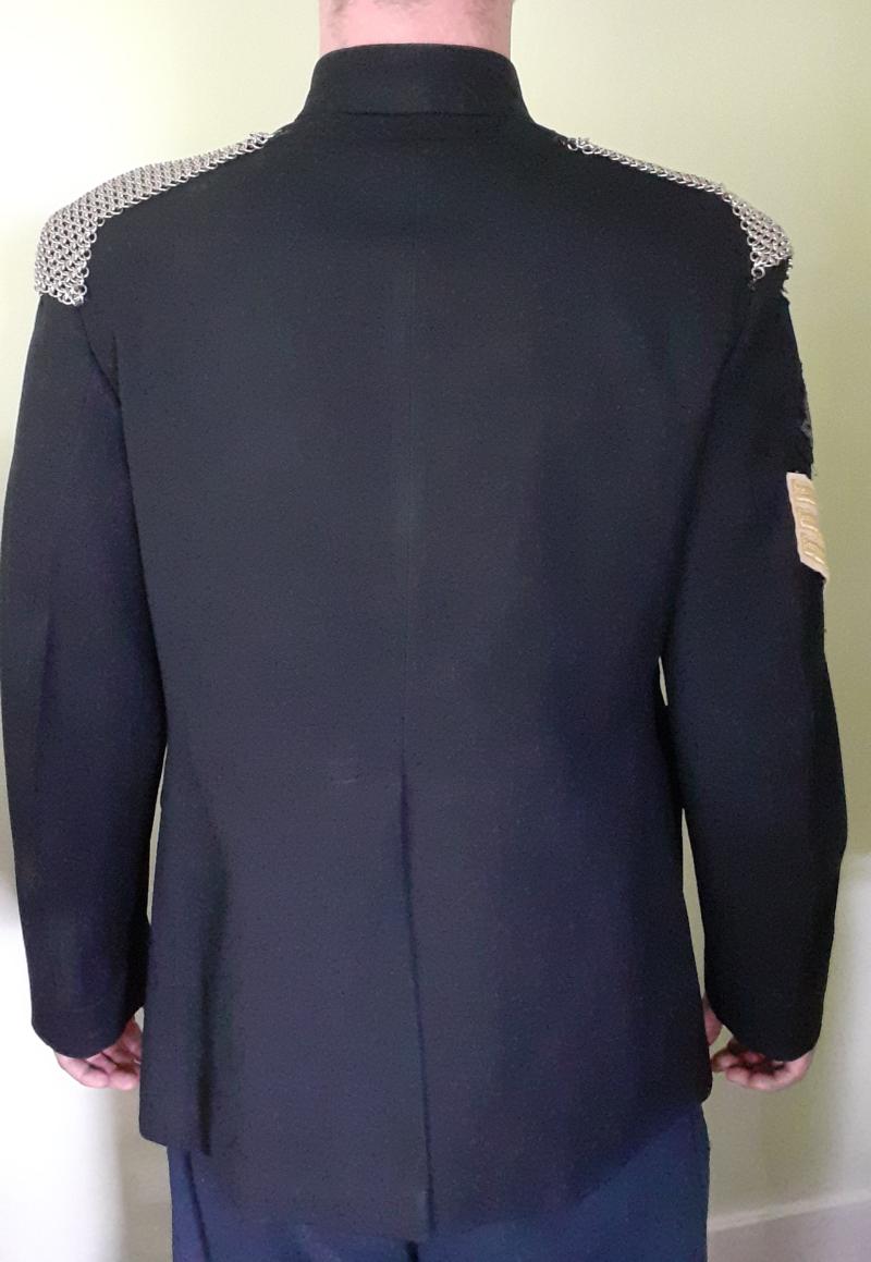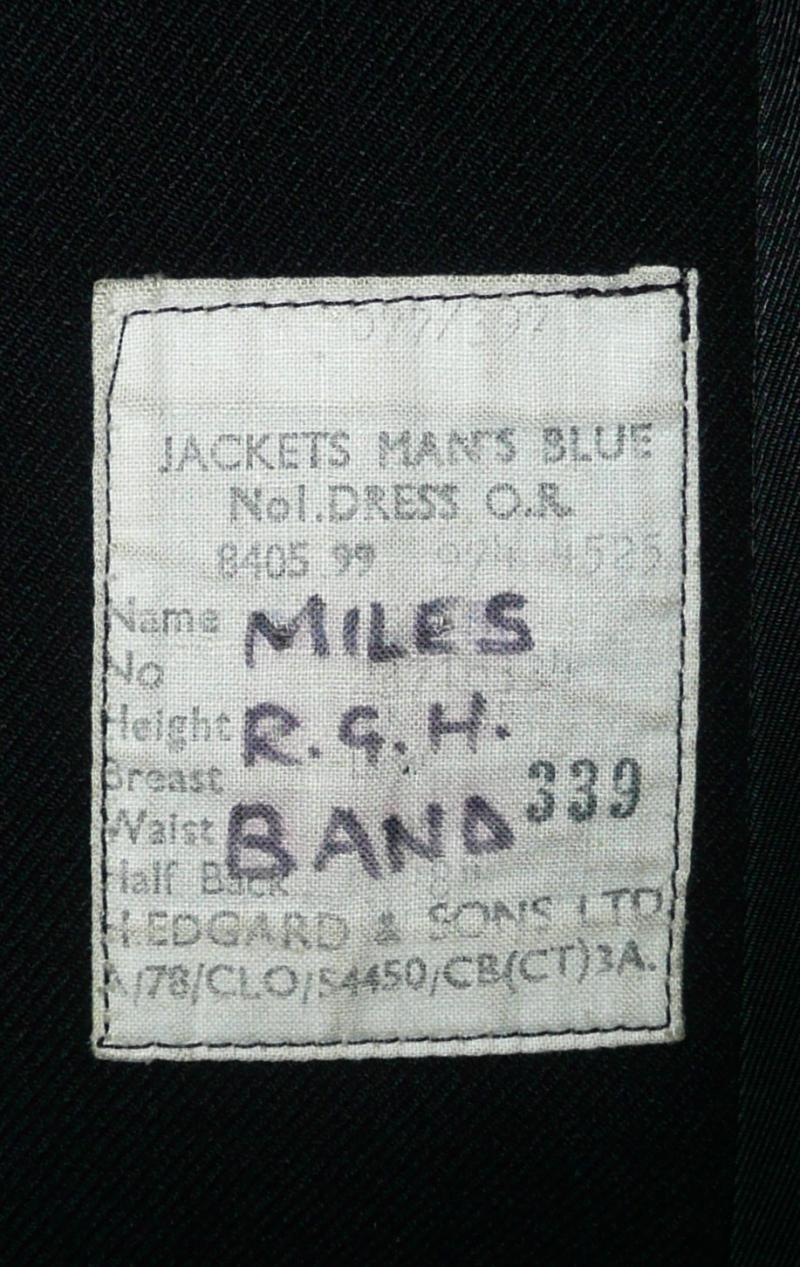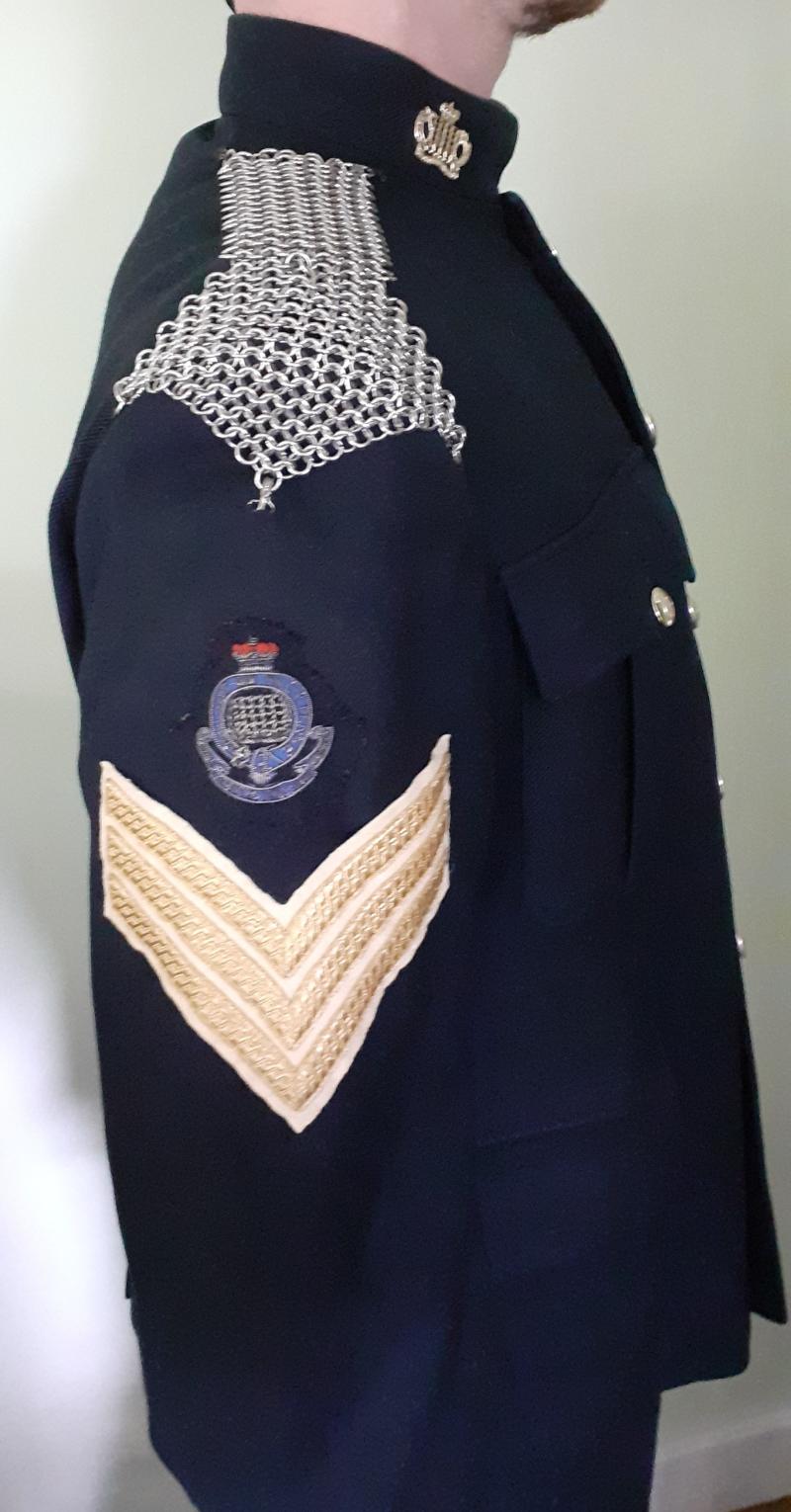 An NCO's / Sergeant's No1 Full Dress Dark Blue Tunic, complete with all its fittings including the correct anodised collar and all buttons, metal shoulder scales, gold thread chevron with embroidered bullion wire NCO arm badge above. Maker's label shows it was made by I. Edgard & Sons Ltd and a pen annotation has covered the measurements. Attributed to a soldier named "Miles, RGH Band". Some minor signs of service wear, but no moth or obvious damage. Internally the liner is clean and in good condition overall with only a minor pull or two to the internal seams. Some staining to inner neck cloth and this is wear the most wear is obvious but does not detract from it when closed. A scarce jacket in very good condition for age. Just needs a belt to set it off. Would display very well. The person who posed to wear it has a 38inch chest and it fitted him well. However, it is being sold as a collectable and no guarantees are given as to its suitability to be worn. Worn until1967.