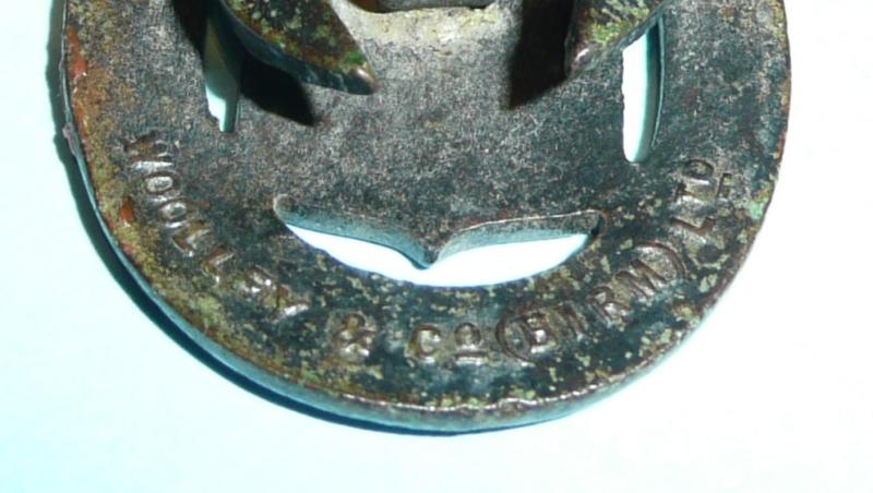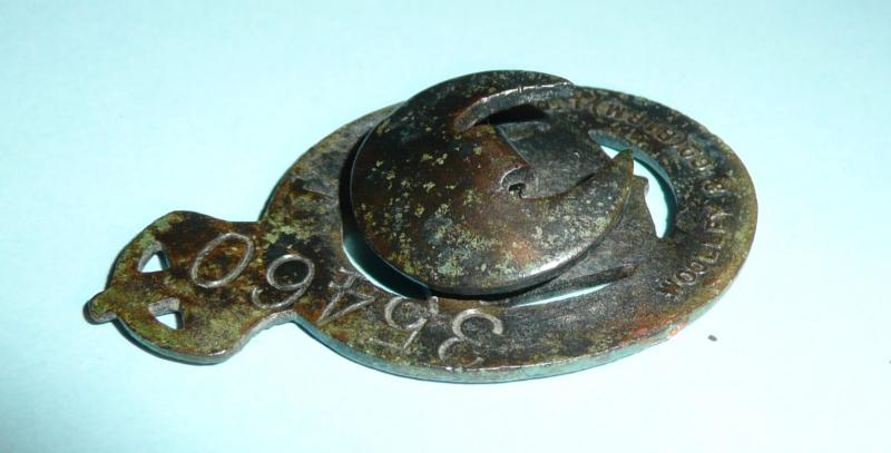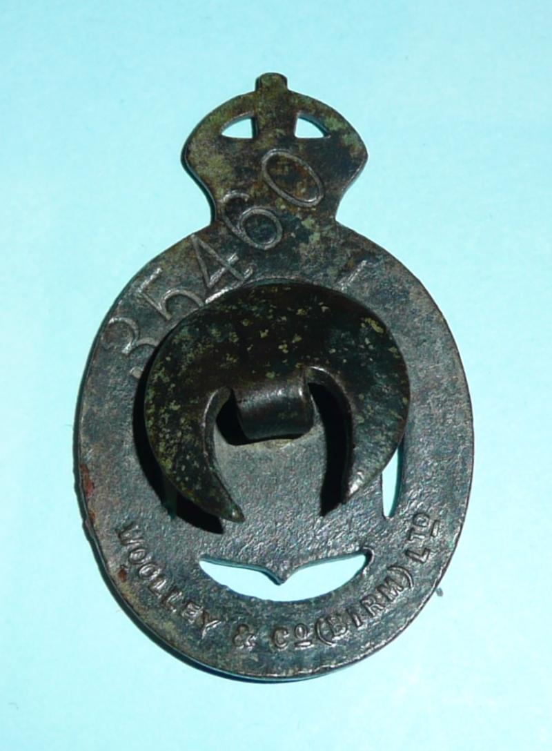 A scarce original First World War official 'On War Service 1915 munition workers badge', unusual bronzed finish, the centre bearing the 'Board of Ordnance' shield, the reverse impressed with maker's details 'Woolley & Co (Birm) Ltf. and official issue number '35460'. In good condition, complete with original buttonhole fitting (slightly squashed over), otherwise in good overall condition. Scarce maker.