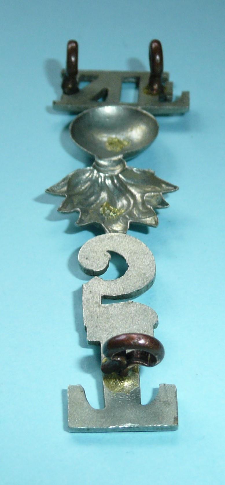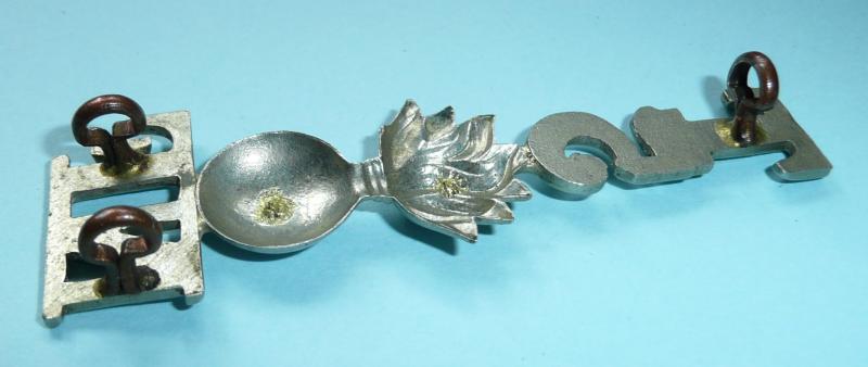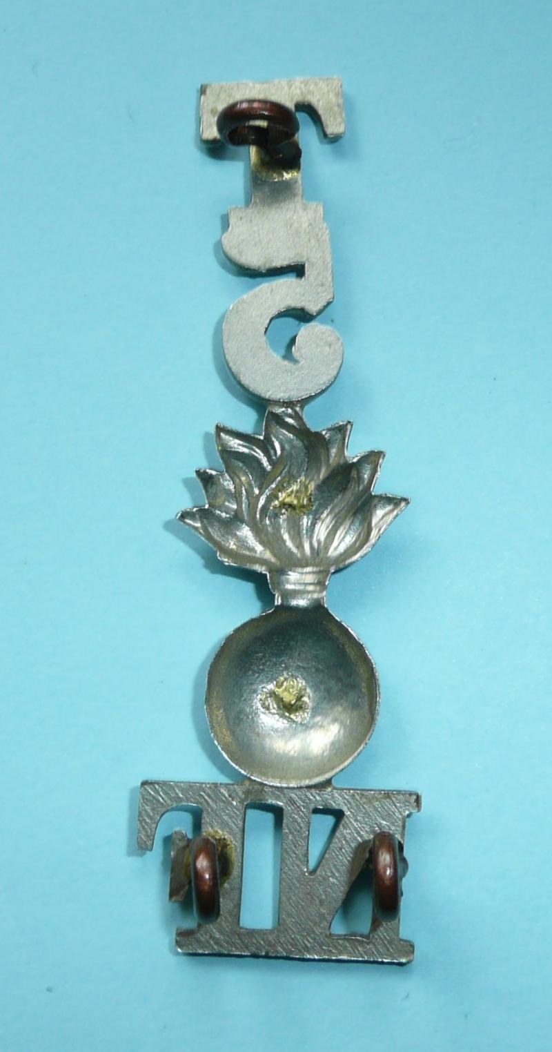 A scarce one piece white metal shoulder title as worn by other ranks of the 5th (Territorial Force) Battalion, the Northumberland Fusiliers. Three original dark toned D style loops to the reverse. Grenade has been modified by the removal of its lugs by the manufacturer. The other ones of this type viewed have this modification. Worn circa 1908 - 1925 on the blue serge jacket. Scarce.