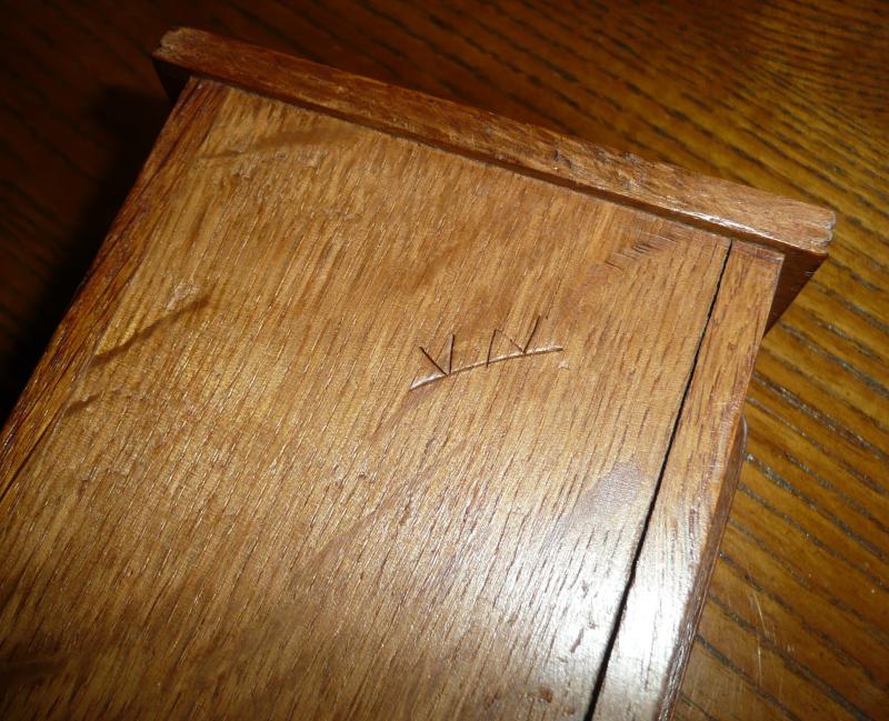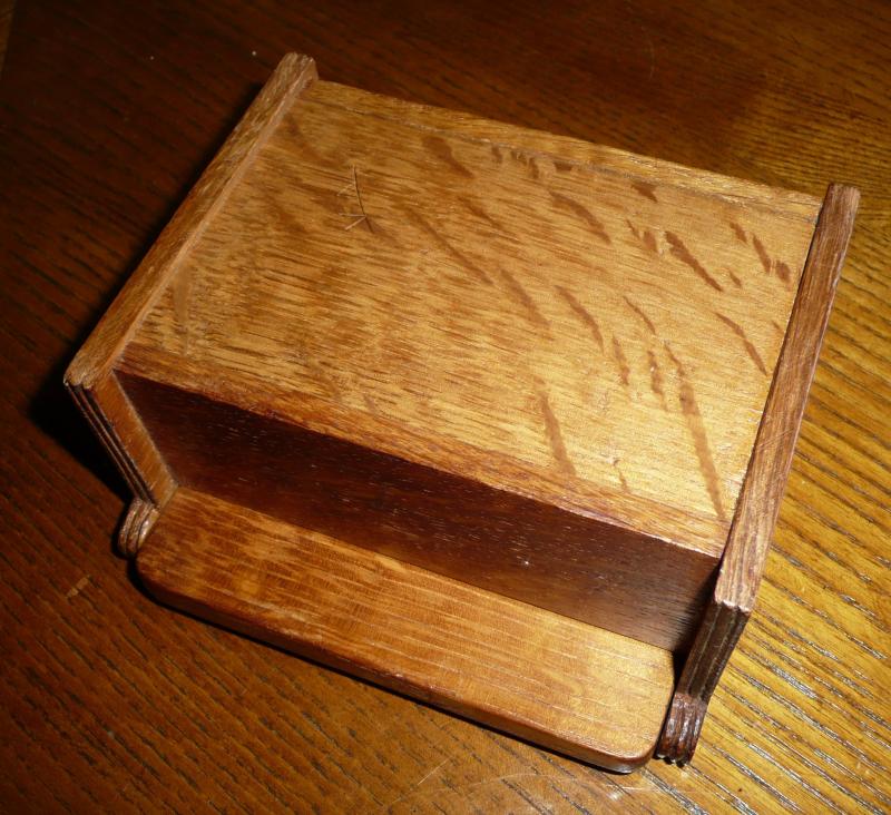 A very attractive little box, well made from Oak and attractively hand carved with the regimental badge of the Royal Berkshire Regiment. Pivot lid with plenty of space to store whatever you wish, mementoes. badges, medals, but most probably originally intended for storing cigarettes. A unique item, Euopean in origin, and not carved in India or the Far East. Initials "V.N." neatly scribed to the reverse. Circa 6.5cms tall and 9cms wide on the base and 13cms by 14cms on the pivot top. Lovely patina and in very good condition, with no damage or worm.