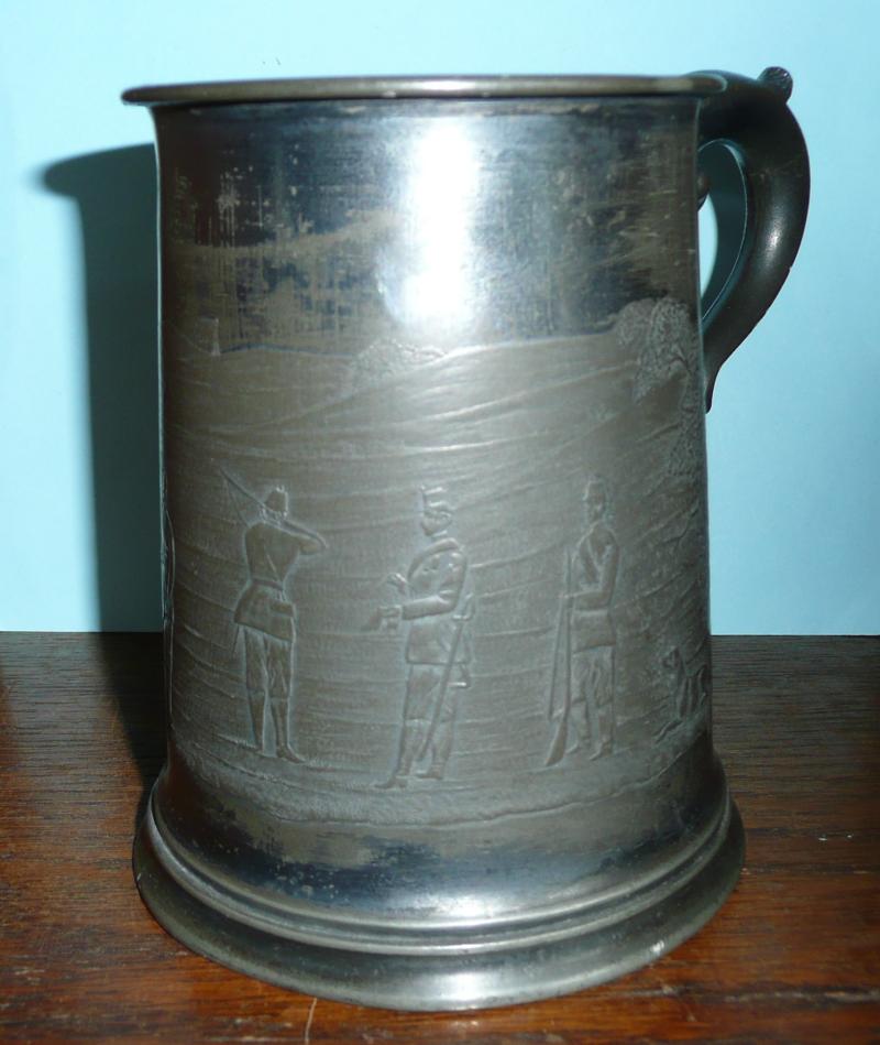 Mid- Victorian Pewter Pint Tankard - Relief Decoration Depicts 1860s Style Rifle Volunteers On Exercise