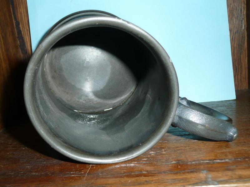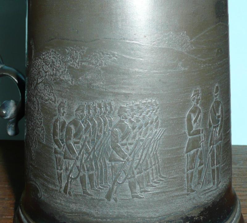 A decorated panel in relief on the outside face of the tankard shows some 1860s style Rifle Volunteers marching in the countryside and shooting, with a dog watching on. Some marks to reverse of base. Not sure It holds liquid without leaking (final photo inside is still damp from the test). I think it is best used as a display piece but that is up to you. Early French kepi style hats suggests 1859 - 1870 period. Dulled finsh but in good condition with no unattractive dents or dings. A very well made tankard of good weight.
