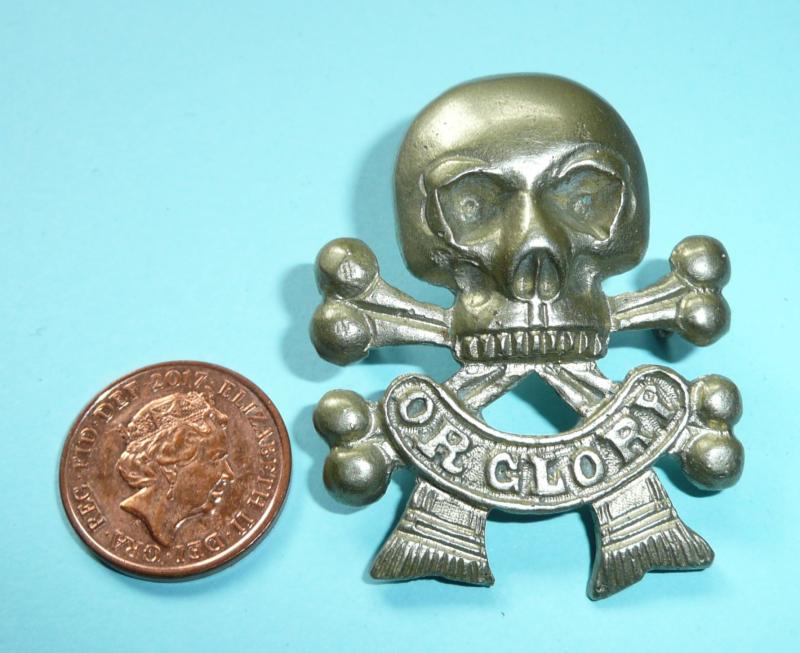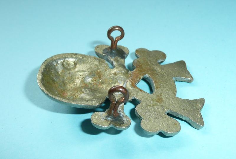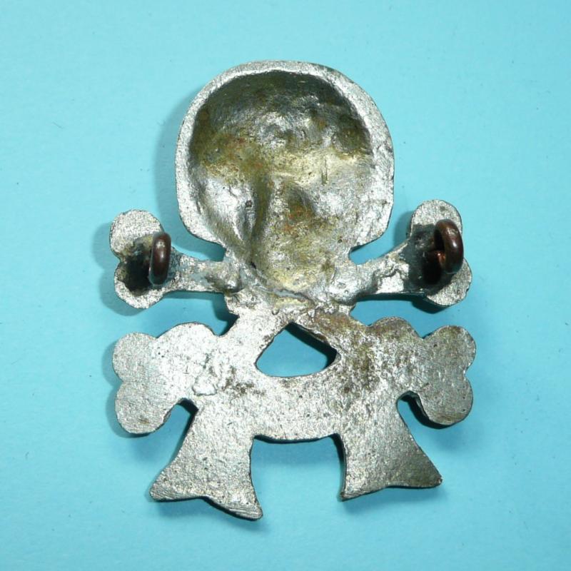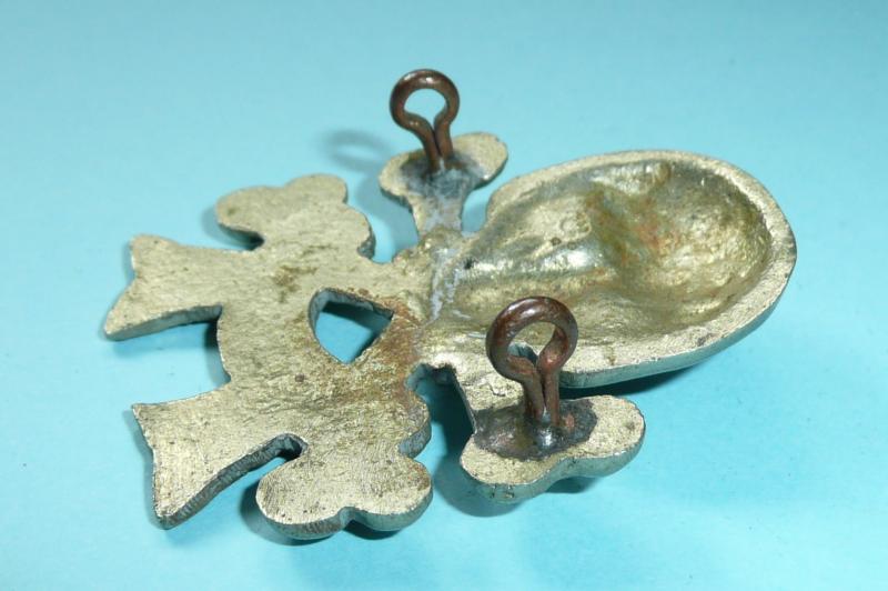 A white metal possibly nickel or silver plated cast arm badge with two original loops to the reverse. It is a scarce pattern without "eyebrows" and a lot more teeth than other examples (nine in total). it also has a particular rounded semi circular scroll bearing the motto "Or Glory". In very good condition. Circa 47mm tall and 37mm wide.