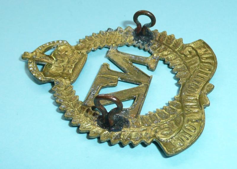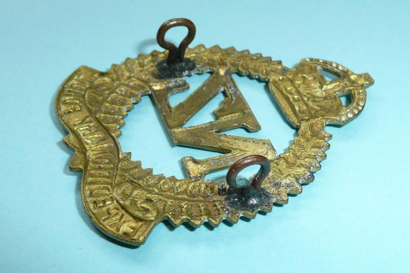 Thinly die struck cap badge, Circa 4.7cms tall and 3.7cms wide, With two original loops to reverse. Worn from August 1916 when compulsory service was introduced. Sharp detail in very good condition and quite scarce.