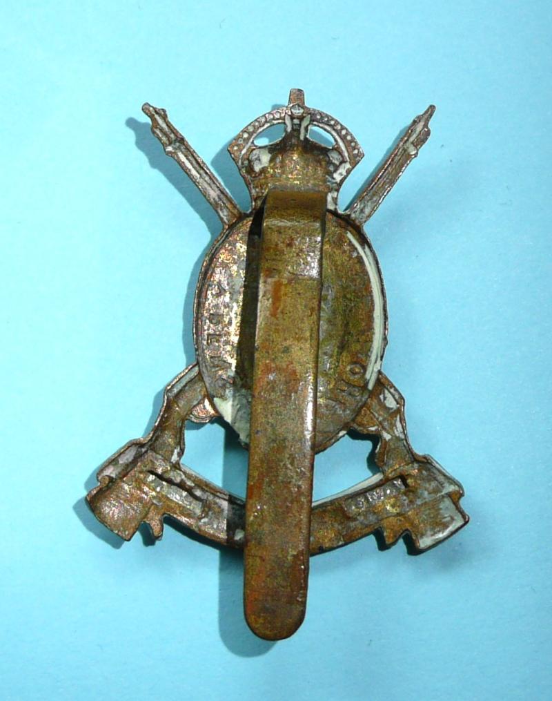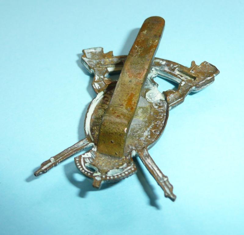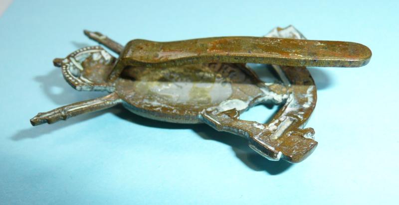 Bi metal cap badge in good condition with original slider and two sweat / braising holes to the reverse of the scroll. With sharp detail. An all brass economy badge was issued in 1916.