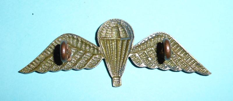 British Army tropical dress parachutist badge, die struck with D shaped lugs correctly centred and correct distant apart. Good detail front and back. As introduced and worn from mid 1950s. Worn on the sleeve of No3 Tropical Dress. Also worn on the chef's whites of a very few parachute trained chefs.