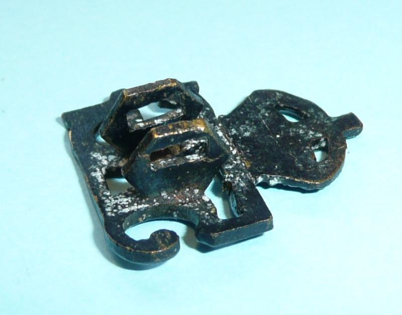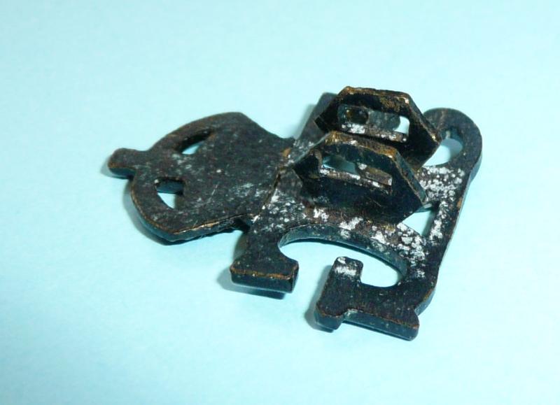 As worn by all ranks of the Regiment between 1924 and 1950. One of a number of variations and patterns, this one matching 5GR F17F (see below). Circa 26mm tall and 21mm wide. Two original hexagonal fixing loops. Some minor bending from service wear but black finish in good condition.