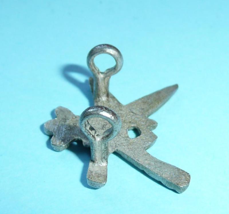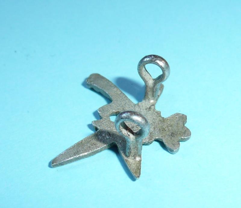 In unmarked Indian silver, sand cast and with two small silver loops and circa 19mm wide and 17mm high. As worn circa 1924 - 1947 on the Officer's mess jacket. This one possibly made by the Regiment's in-house silver smith (Each battalion of Gurkhas somewhat uniquely in the British Army had its own silversmith).