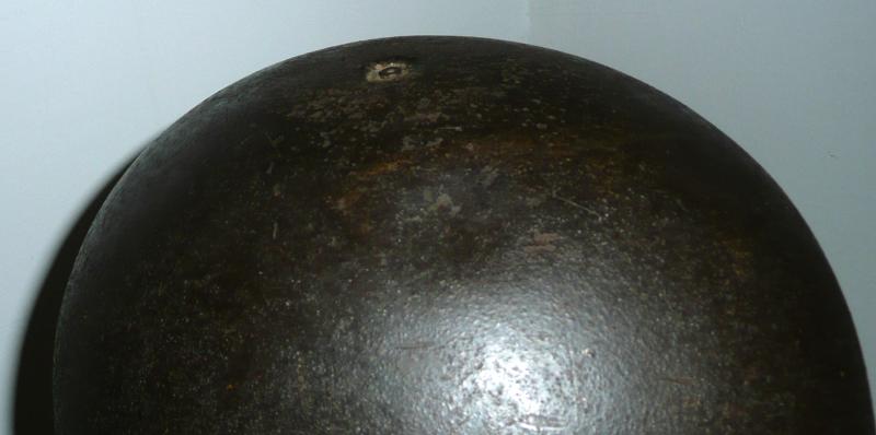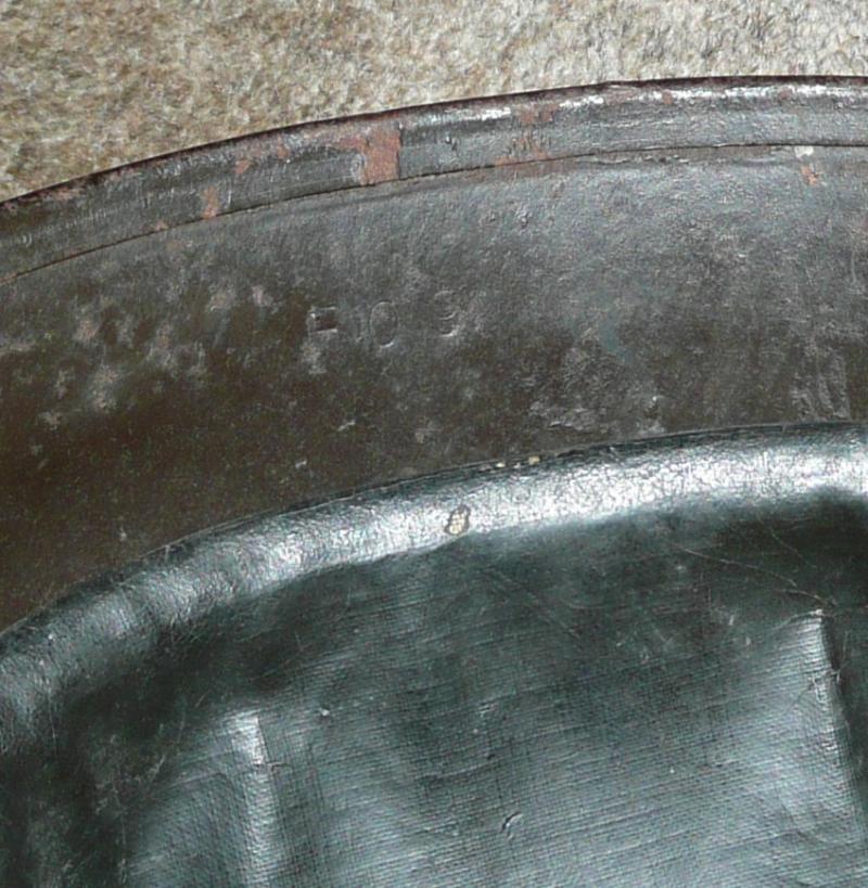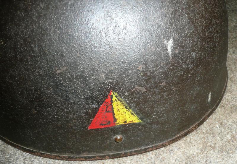 Royal Armoured Corps HSRAC tankers helmet Mark II pattern as manufactured from circa March 1945 with the 'lift the dot' system removable liner and the Mark III quick release pattern chin strap. The only marking I can find is a stamp to the inner shell of the helmet 'F09'. I have seen this marking on another helmet. Despite looking hard internally at the liner and strap I can see no other code, date or maker's mark. It retains its original sand textured dark olive drab paint finish and also the RAC hand painted triangle of red and yellow to one side, which appears to be contemporary and not added later. One small dent to shell, slight veneer of rust to inner surface of shell otherwise in good original condition including the liner, the rubber cross and chinstrap, which is still functional and a clever design. A couple of spurious and small white paint marks to outer shell. Scarce.