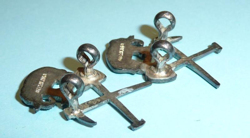 UK made both marked sterling with two of two original silver loops to the reverse of each. Facing and matching, depicting and Indian Elephant over pioneer crossed spade and pick axe. Gorgeous pair and scarce (trace of bluetack to reverse of one shaft, now removed). Circa 25mm tall.