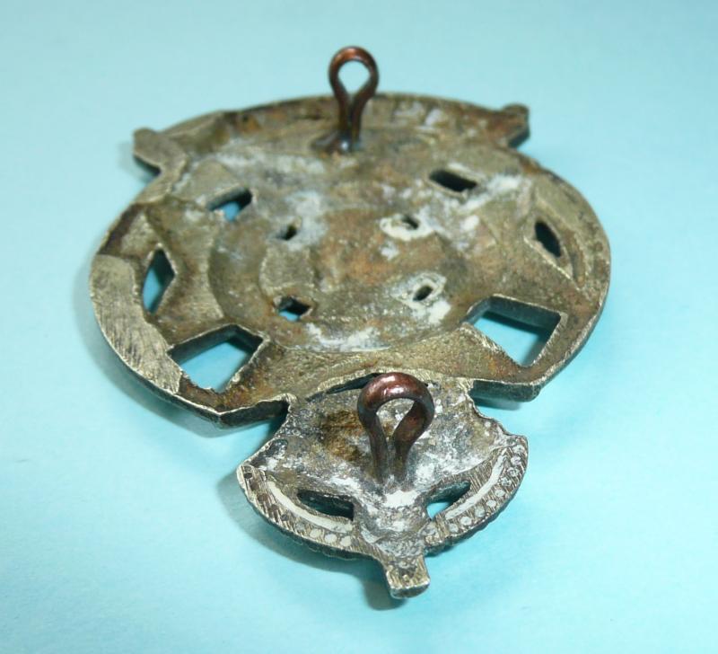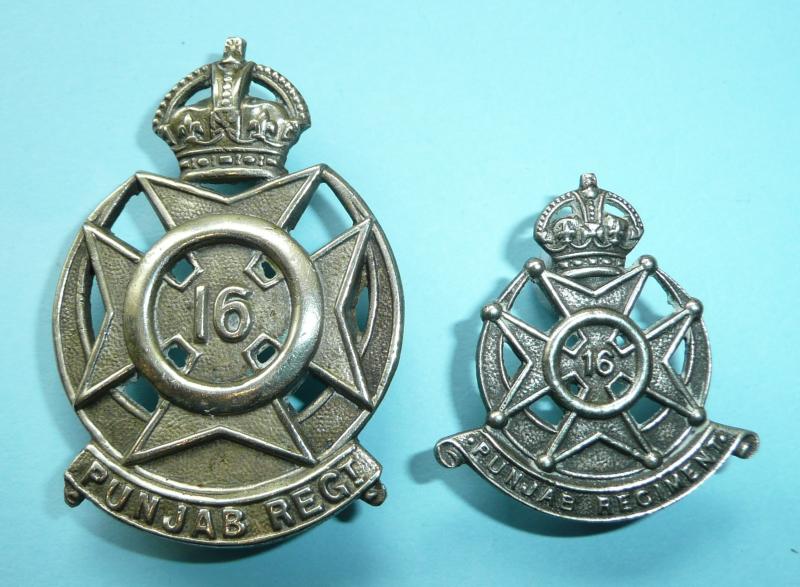 A large white metal finely cast theatre-made badge in the form of a crowned Maltese cross, behind which is a Muslim crescent, bearing a Sikh quoit with ‘16’ to centre. “PUNJAB REGT” below, with two small original copper loops to the reverse (north-south). Circa 53mm tall. This is the same pattern and size as worn by officer's on the pagri from 1922 onwards but this is theatre cast in white metal with two original small copper loops to the reverse (north-south).