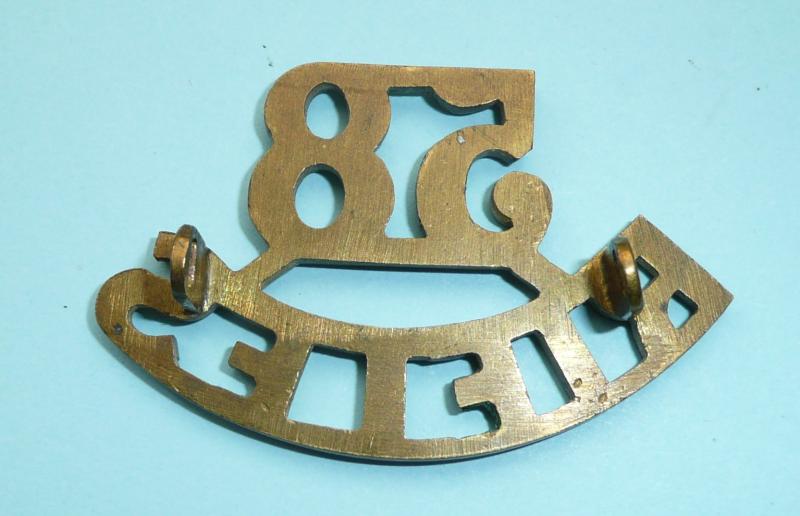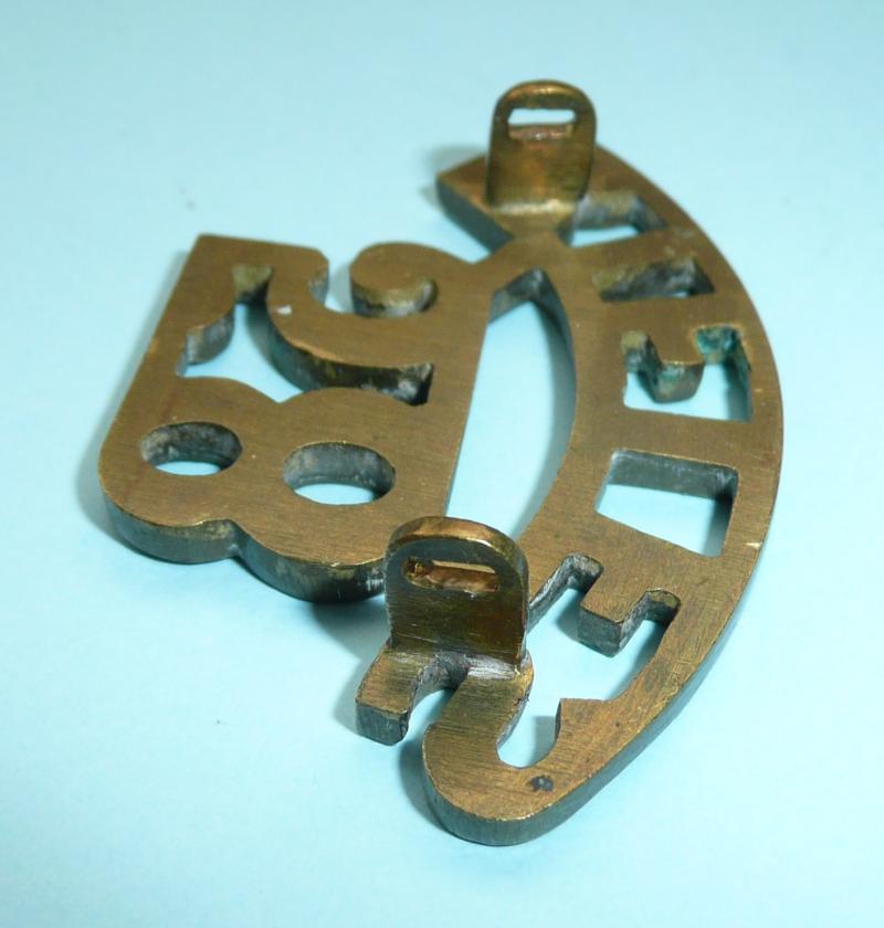 A thickly made brass title of some quality with two original tombstone style fixings to the reverse,numerals '58' above a semi-circular formed "RIFLES". I suspect it to have been made my a UK manufacturer, although it is not maker marked. In super condition. Worn until 1922.