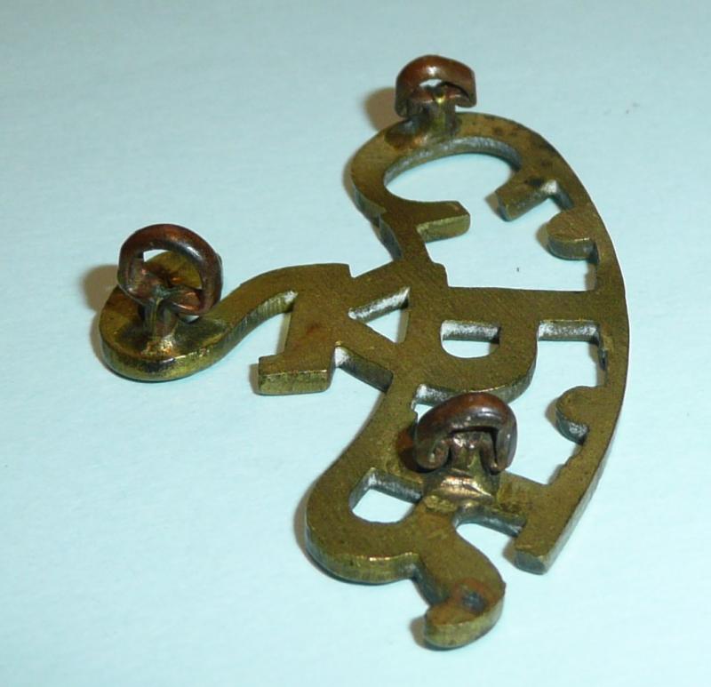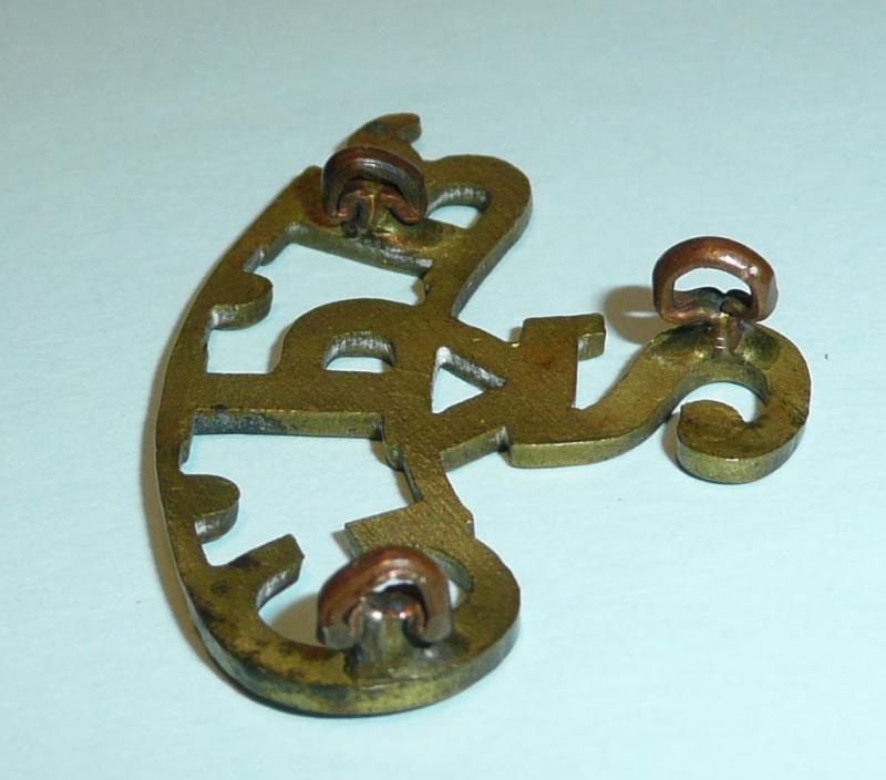A one piece brass title with three original loops (some squashing but functional). Light staining to front. As worn by the 2nd Battalion.