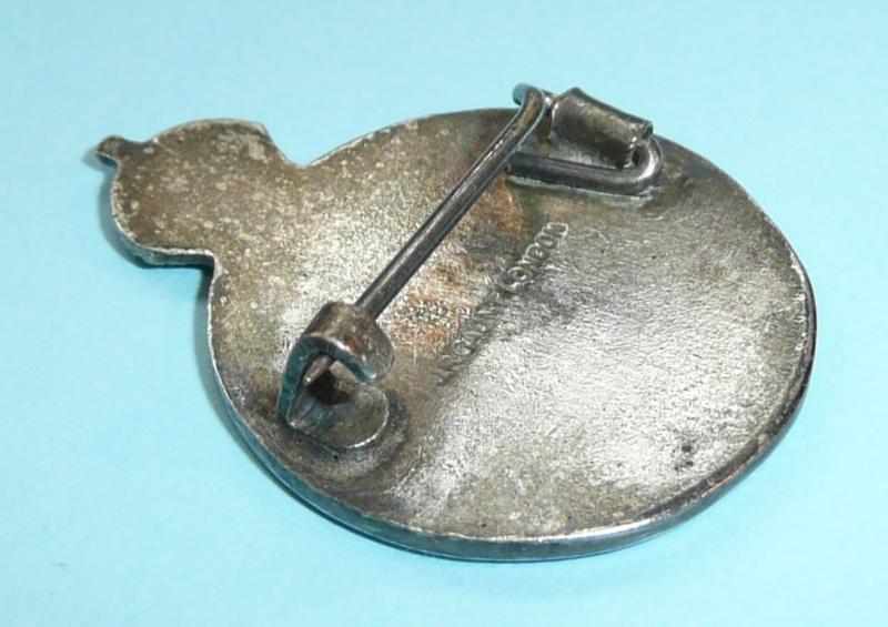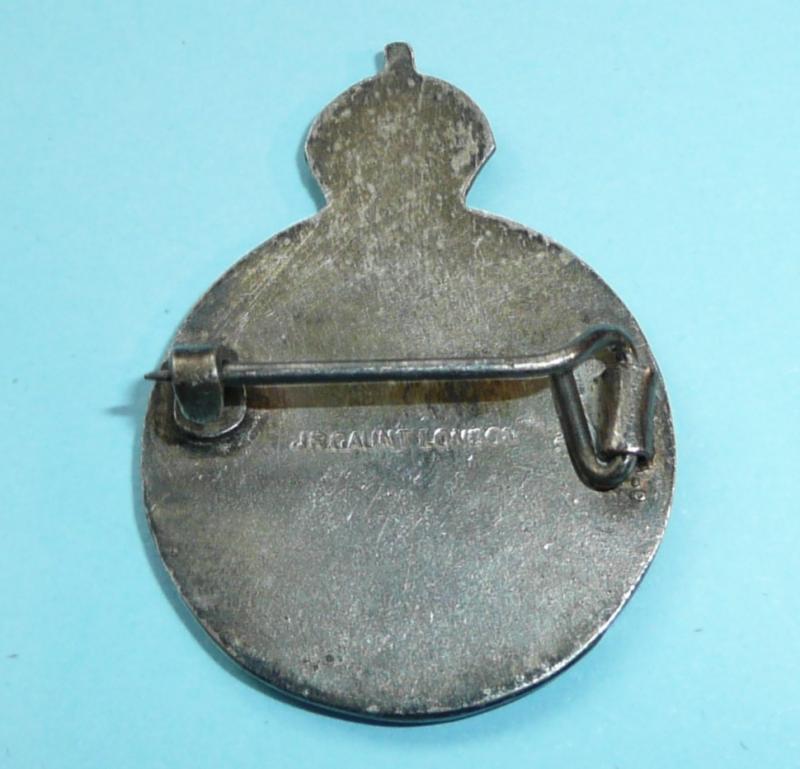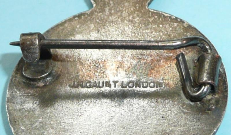 In good worn condition, a few marks and rubbing to silver plate to front and but enamel intact and undamaged. Original and functional pin fitting and maker marked JR Gaunt London. Circa 33mm tall.